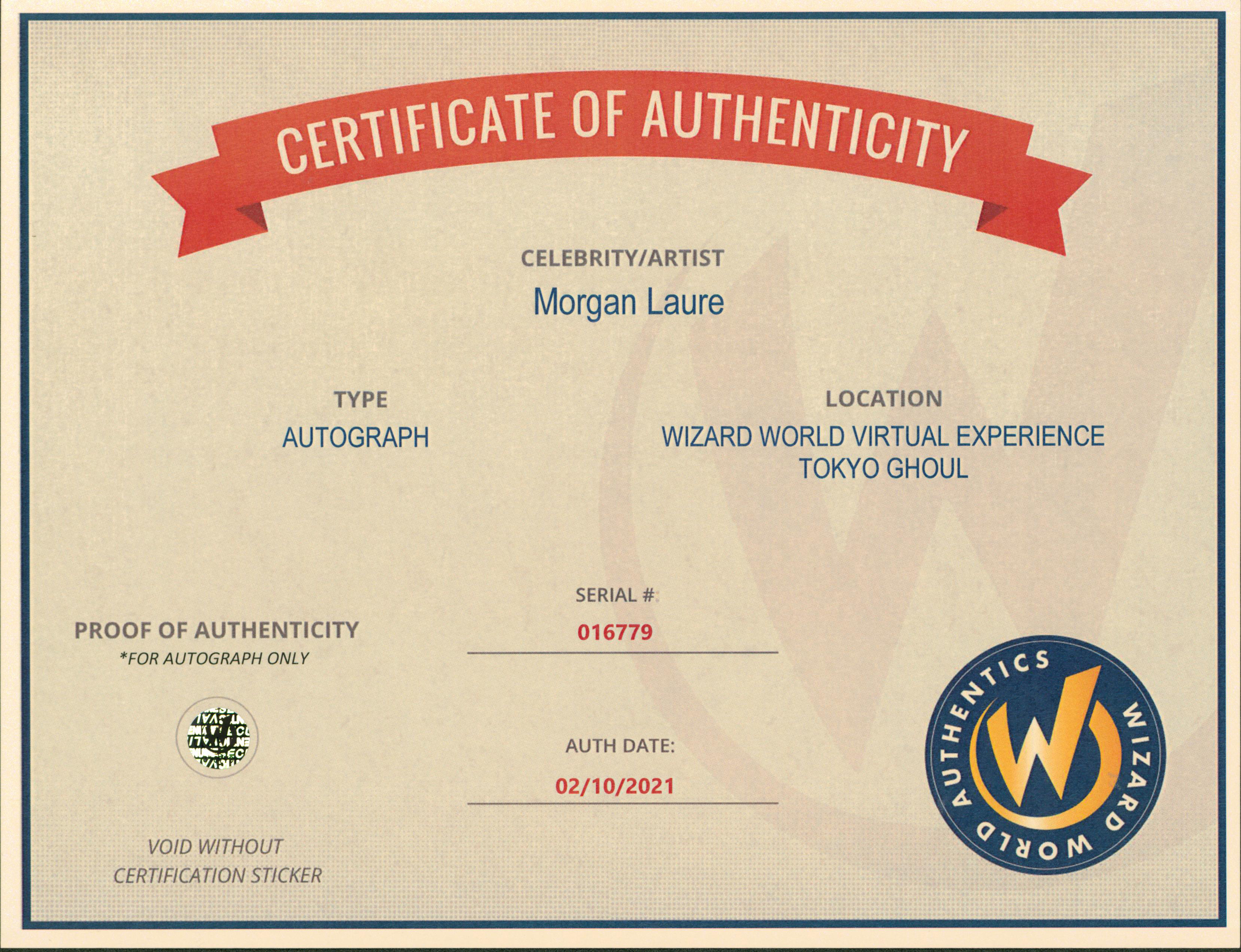 This Autographed 8x10 Photo with the inscription of "MADO" has been Personally Signed by Morgan Laure of Tokyo Ghoul. This item is 100% Authentic to include a Certificate of Authenticity (COA) / hologram by Wizard World Authentics. A Wizard World Authentics representative was present when this item was being signed, the date of the signing is notated on the COA. We have multiples of this same item. While the photographs are representative of this item, the size, placement and strength of the signature may vary. Each item is hand signed, therefore, each autograph is unique.
