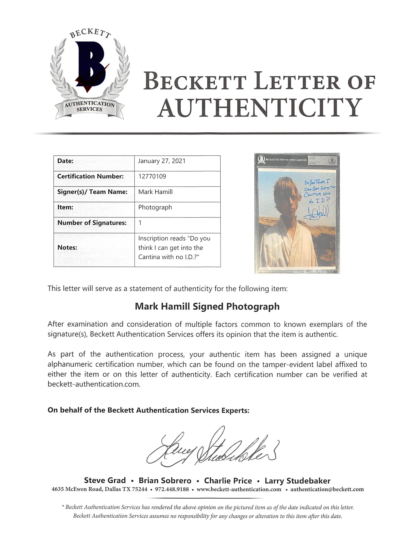 This Autographed 8x10 Photo with the inscription of "Do you think I can get into the Cantina with no I.D.?" has been Personally Signed by Mark Hamill of Star Wars A New Hope. This item is 100% Authentic, it comes slabbed and authenticated by Beckett Authentication Services. The authenticity can be verified on Beckett Authentication Services website.