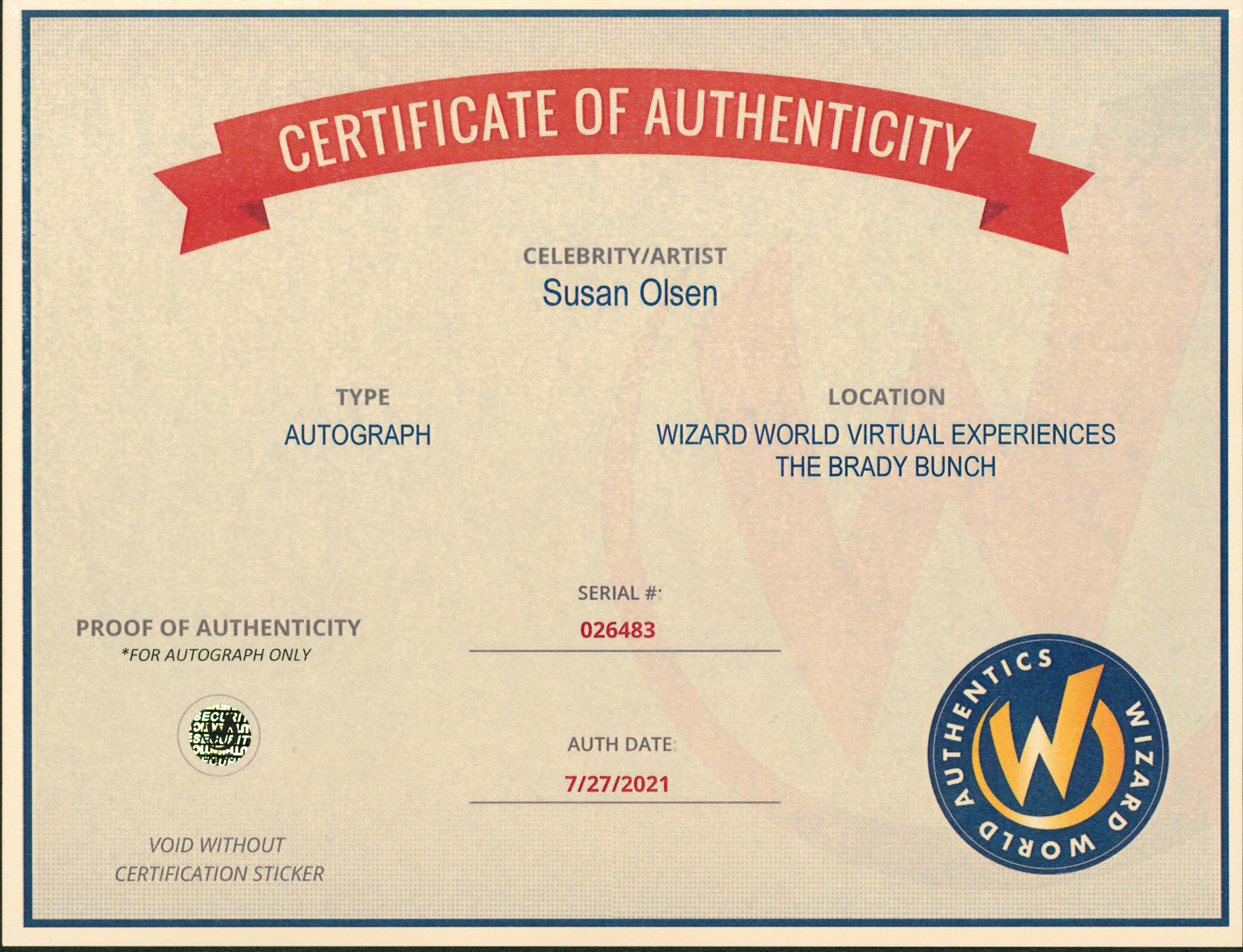 This Autographed 8x10 Photo has been Personally Signed by Susan Olsen of The Brady Bunch. This item is 100% Authentic to include a Certificate of Authenticity (COA) / hologram by Wizard World Authentics. A Wizard World Authentics representative was present when this item was being signed, the date of the signing is notated on the COA. We have multiples of this same item. While the photographs are representative of this item, the size, placement and strength of the signature may vary. Each item is hand signed, therefore, each autograph is unique.