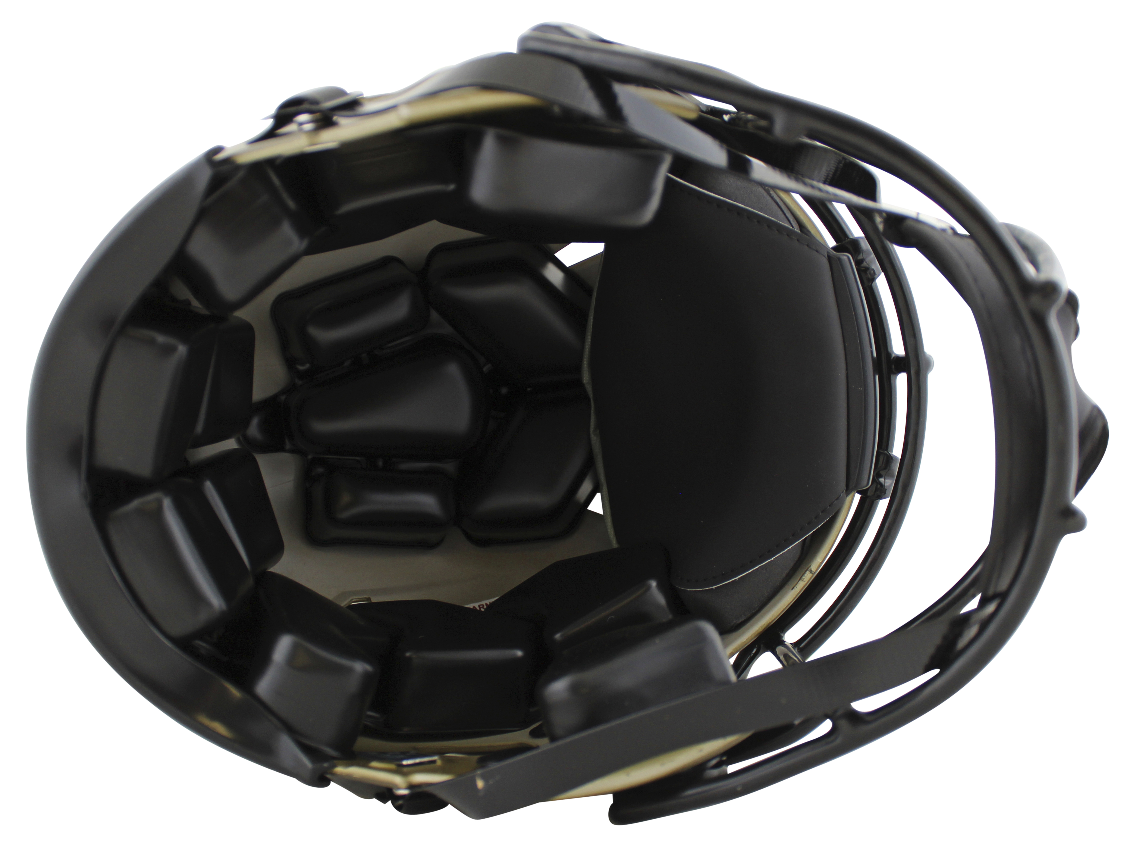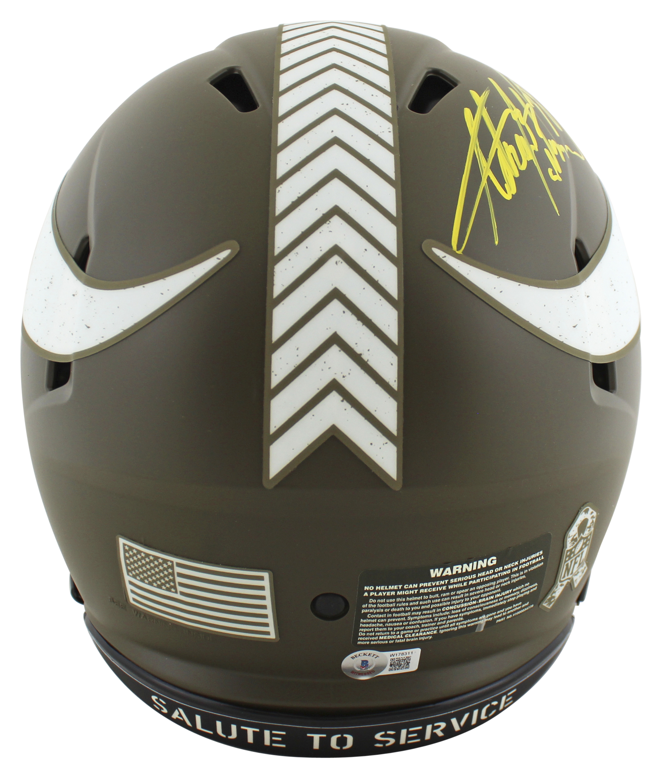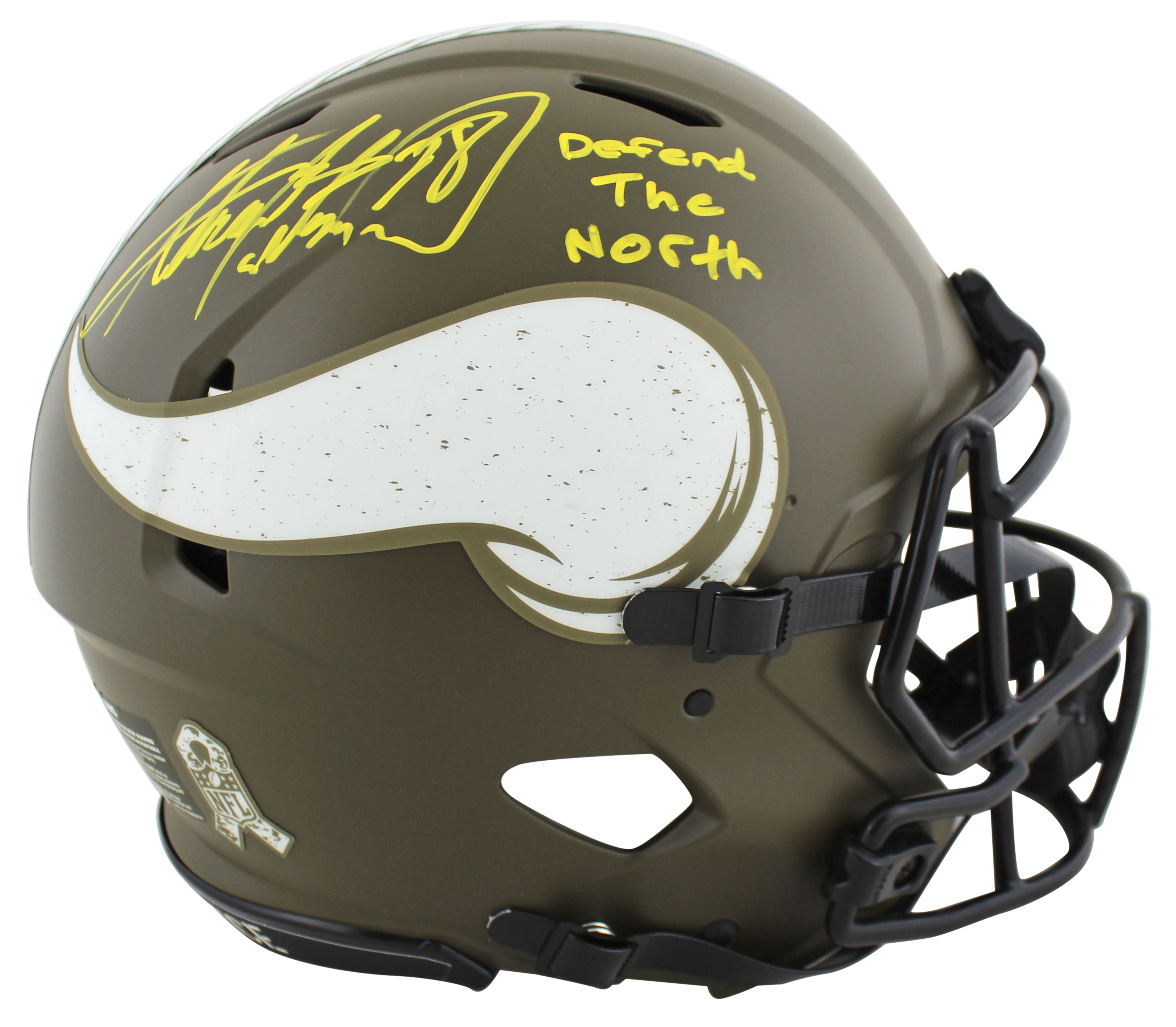 This Autographed Alternate Salute To Service Riddell Authentic Full Size Speed Proline Helmet with the inscription of "Defend The North" has been Personally Signed by Adrian Peterson of the Minnesota Vikings. This item is 100% Authentic to include a hologram by Beckett Authentication Services. This item may come with the new Beckett Authentication hologram that has a scannable QR code rather than the traditional COA. If you would like to have a COA, you are welcome to reach out to Beckett for a printed certification once you receive your item. This is a BAS Witnessed Protection Program item which means a Beckett Authentication Service representative was present when this item was being signed. We conducted an autograph signing with Adrian Peterson where multiples of the same item were signed. While the photographs are representative of this item, the size, placement and strength of the signature may vary. Each item is hand signed, therefore, each autograph is unique. This item can be verified through BAS Witnessed.