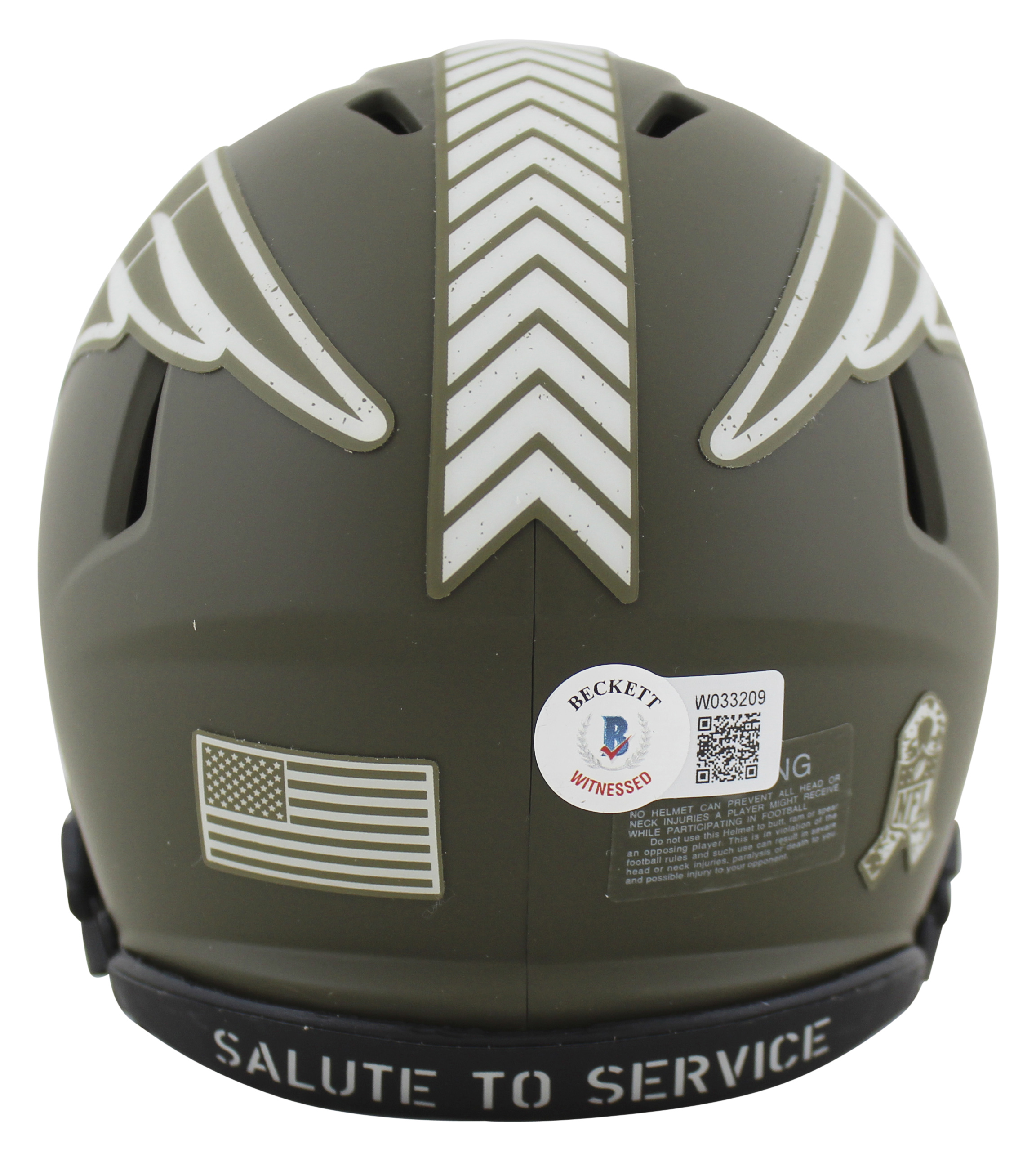 This Autographed Alternate Salute To Service Speed Mini Helmet has been Personally Signed by Randy Moss of the New England Patriots. This item is 100% Authentic to include a hologram by Beckett Authentication Services. This item may come with the new Beckett Authentication hologram that has a scannable QR code rather than the traditional COA. If you would like to have a COA, you are welcome to reach out to Beckett for a printed certification once you receive your item. This is a BAS Witnessed Protection Program item which means a Beckett Authentication Service representative was present when this item was being signed. We conducted an autograph signing with Randy Moss where multiples of the same item were signed. While the photographs are representative of this item, the size, placement and strength of the signature may vary. Each item is hand signed, therefore, each autograph is unique. This item can be verified through BAS Witnessed.