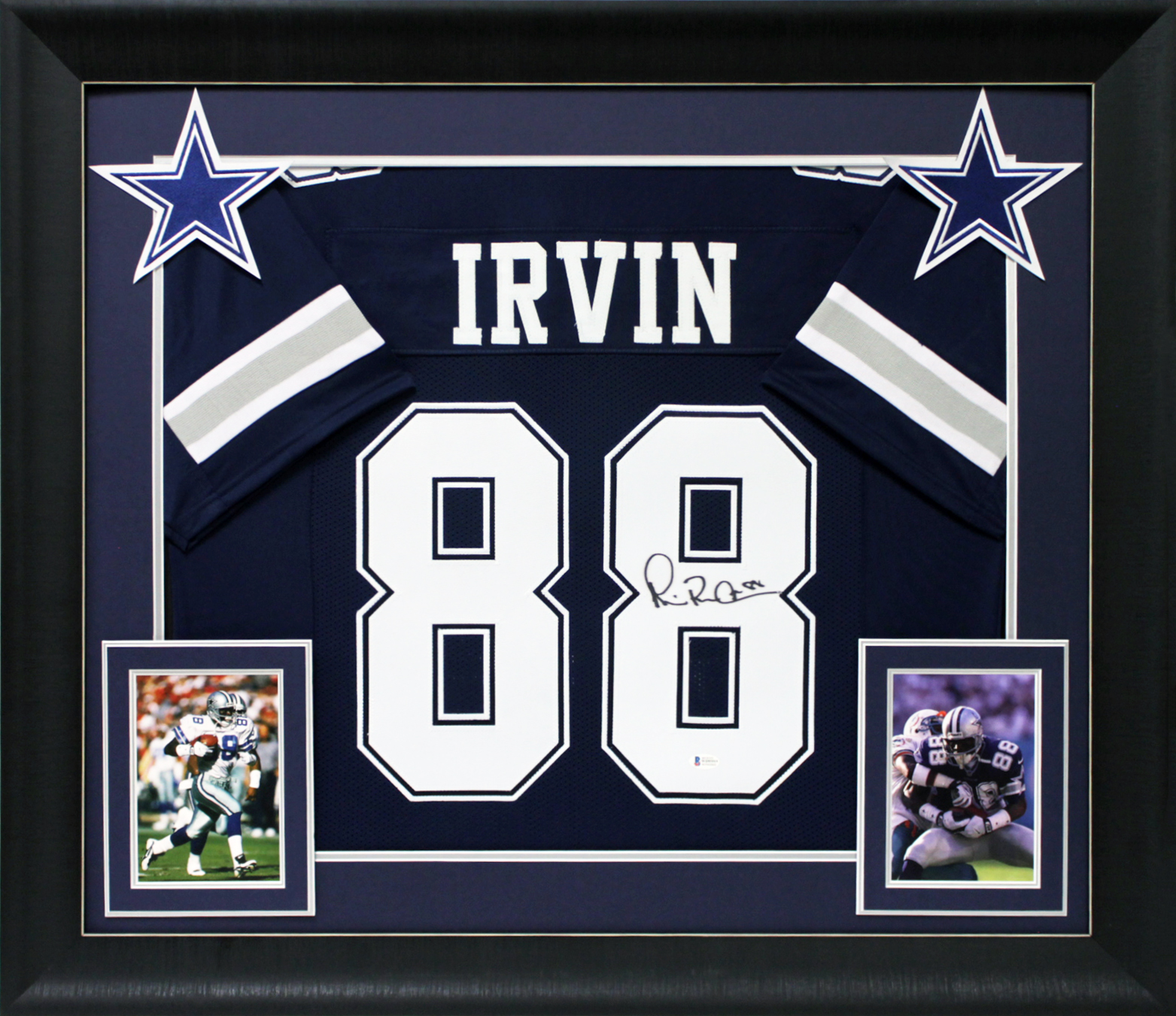 This Autographed Navy Blue Pro Style Framed Jersey has been Personally Signed by Michael Irvin of the Dallas Cowboys. This item is 100% Authentic to include a hologram by Beckett Authentication Services. This item may come with the new Beckett Authentication hologram that has a scannable QR code rather than the traditional COA. If you would like to have a COA, you are welcome to reach out to Beckett for a printed certification once you receive your item. This is a BAS Witnessed Protection Program item which means a Beckett Authentication Service representative was present when this item was being signed. We conducted an autograph signing with Michael Irvin where multiples of the same item were signed. While the photographs are representative of this item, the size, placement and strength of the signature may vary. Each item is hand signed, therefore, each autograph is unique. This item can be verified through BAS Witnessed. This is a X-Large sized, non-branded, custom-stitched Jersey. This jersey will be framed to order, it will take 3-4 days from purchase date for it to ship.