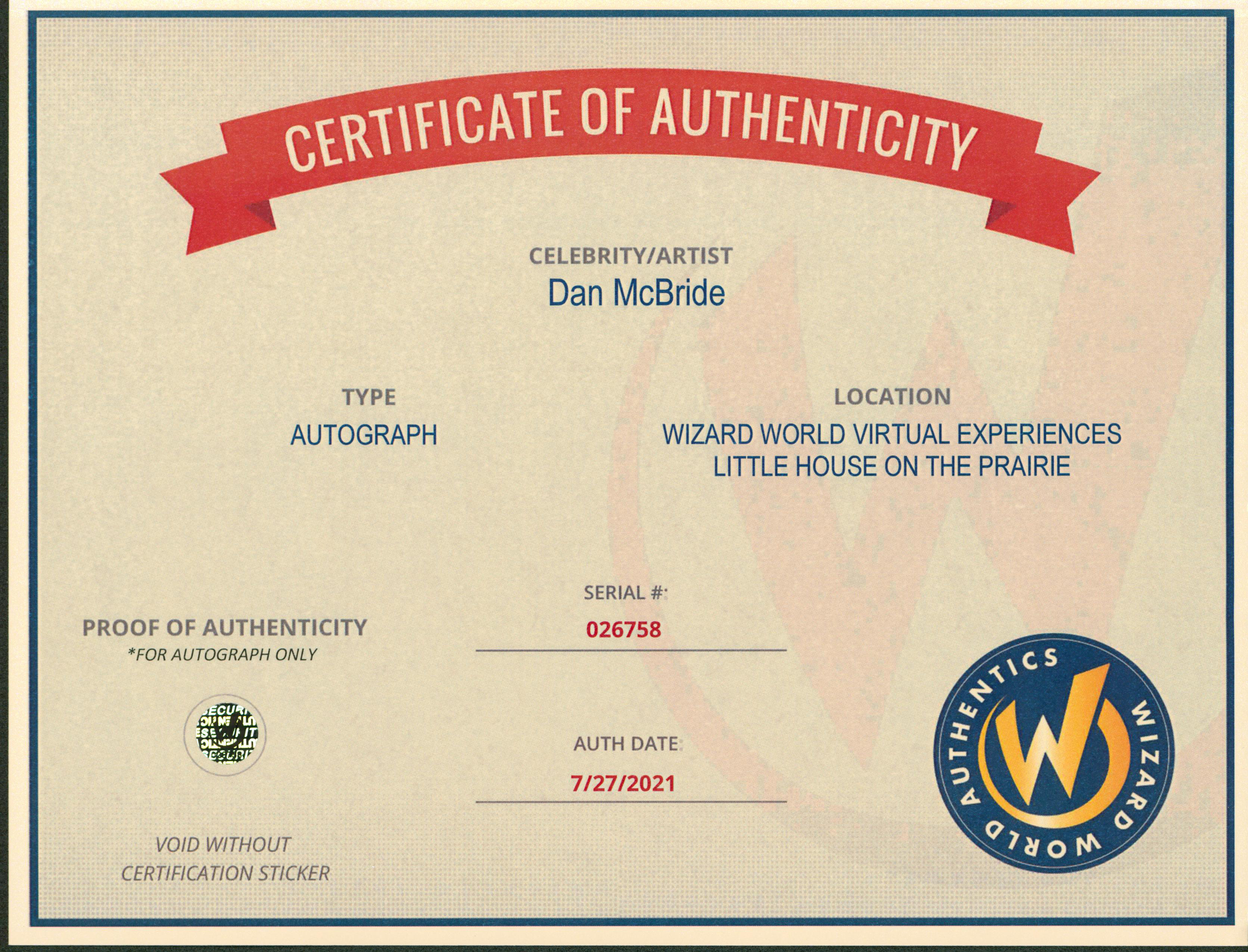 This Autographed 8x10 Photo has been Personally Signed by Dan McBride of Little House on the Prairie. This item is 100% Authentic to include a Certificate of Authenticity (COA) / hologram by Wizard World Authentics. A Wizard World Authentics representative was present when this item was being signed, the date of the signing is notated on the COA. We have multiples of this same item. While the photographs are representative of this item, the size, placement and strength of the signature may vary. Each item is hand signed, therefore, each autograph is unique.