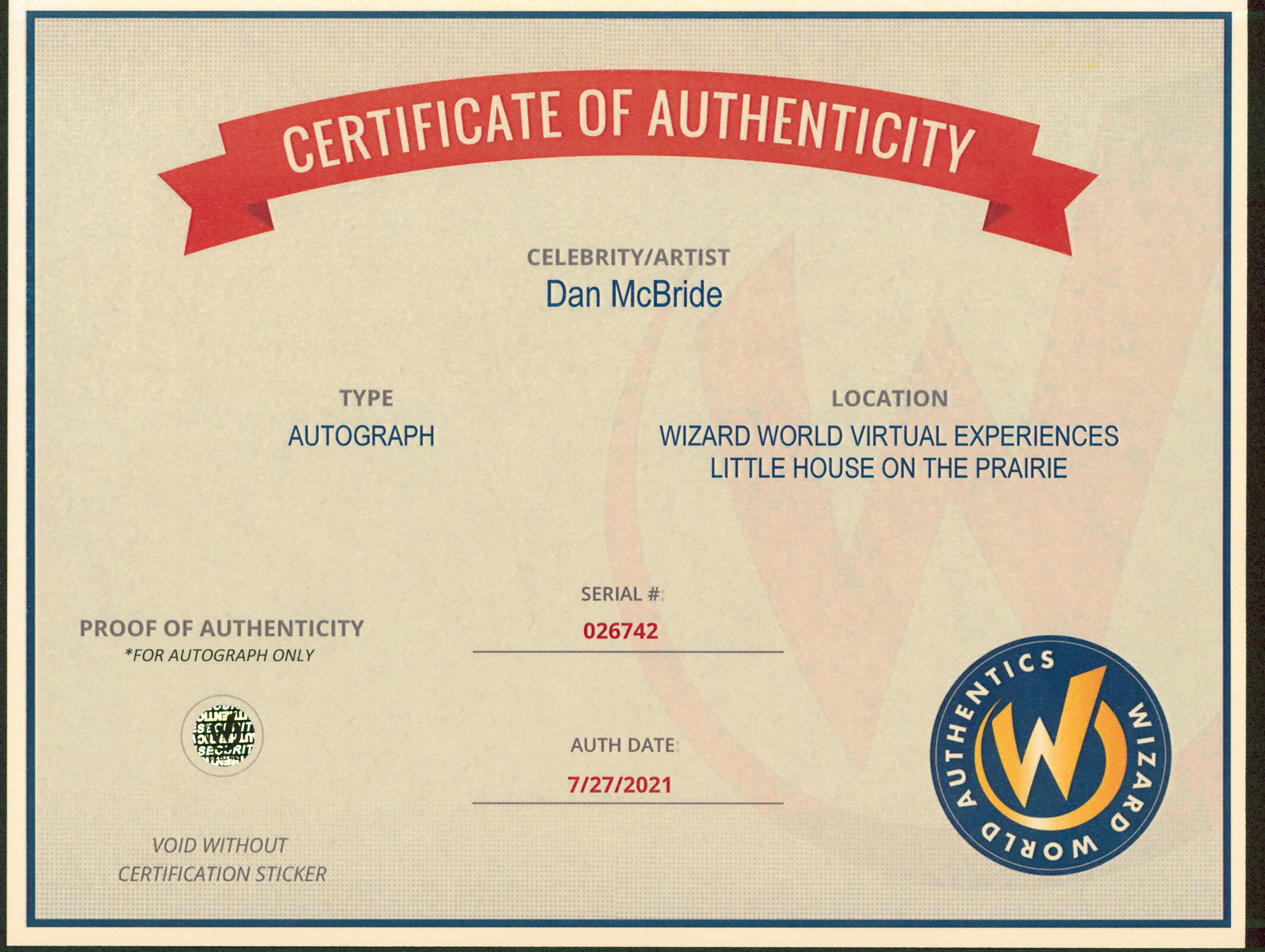 This Autographed 8x10 Photo has been Personally Signed by Dan McBride of Little House on the Prairie. This item is 100% Authentic to include a Certificate of Authenticity (COA) / hologram by Wizard World Authentics. A Wizard World Authentics representative was present when this item was being signed, the date of the signing is notated on the COA. We have multiples of this same item. While the photographs are representative of this item, the size, placement and strength of the signature may vary. Each item is hand signed, therefore, each autograph is unique.