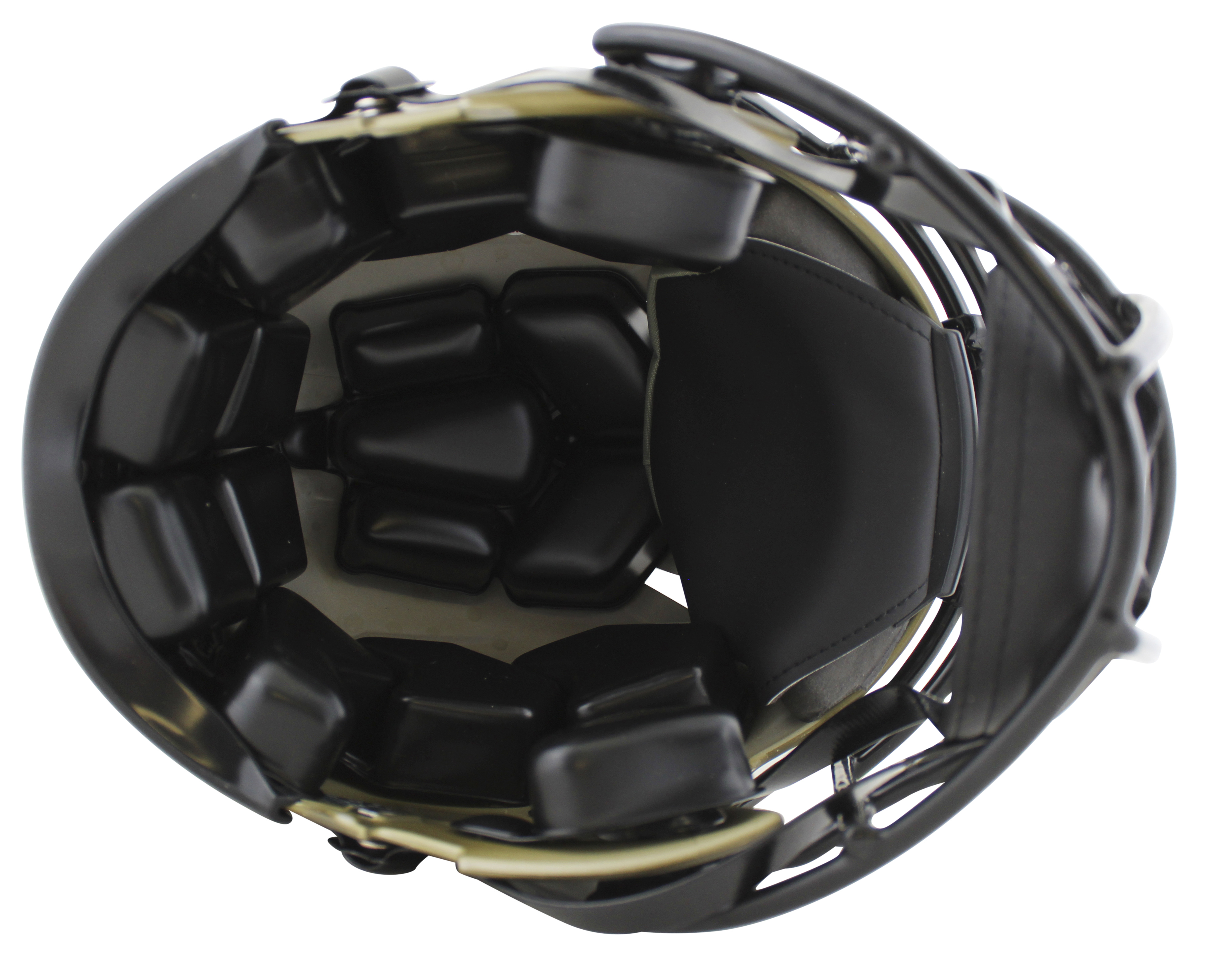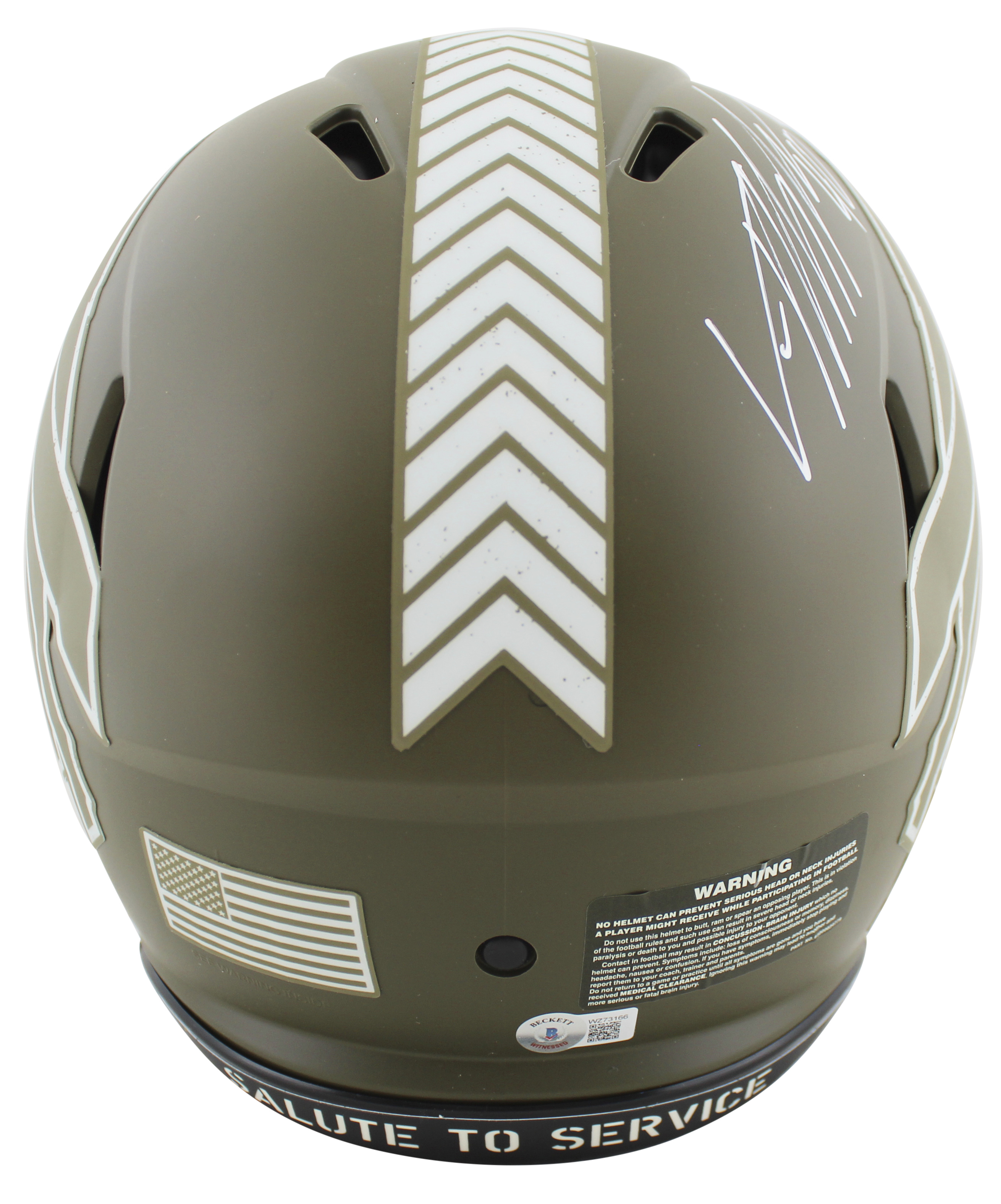 This Autographed Alternate Salute To Service Authentic Full Size Speed Proline Helmet has been Personally Signed by Von Miller of the Buffalo Bills. This item is 100% Authentic to include a hologram by Beckett Authentication Services. This item will come with the new Beckett Authentication hologram that has a scannable QR code rather than the traditional COA. If you would like to have a COA, you are welcome to reach out to Beckett for a printed certification once you receive your item. This is a BAS Witnessed Protection Program item which means a Beckett Authentication Service representative was present when this item was being signed. We conducted an autograph signing with Von Miller where multiples of the same item were signed. While the photographs are representative of this item, the size, placement and strength of the signature may vary. Each item is hand signed, therefore, each autograph is unique. This item can be verified through BAS Witnessed.