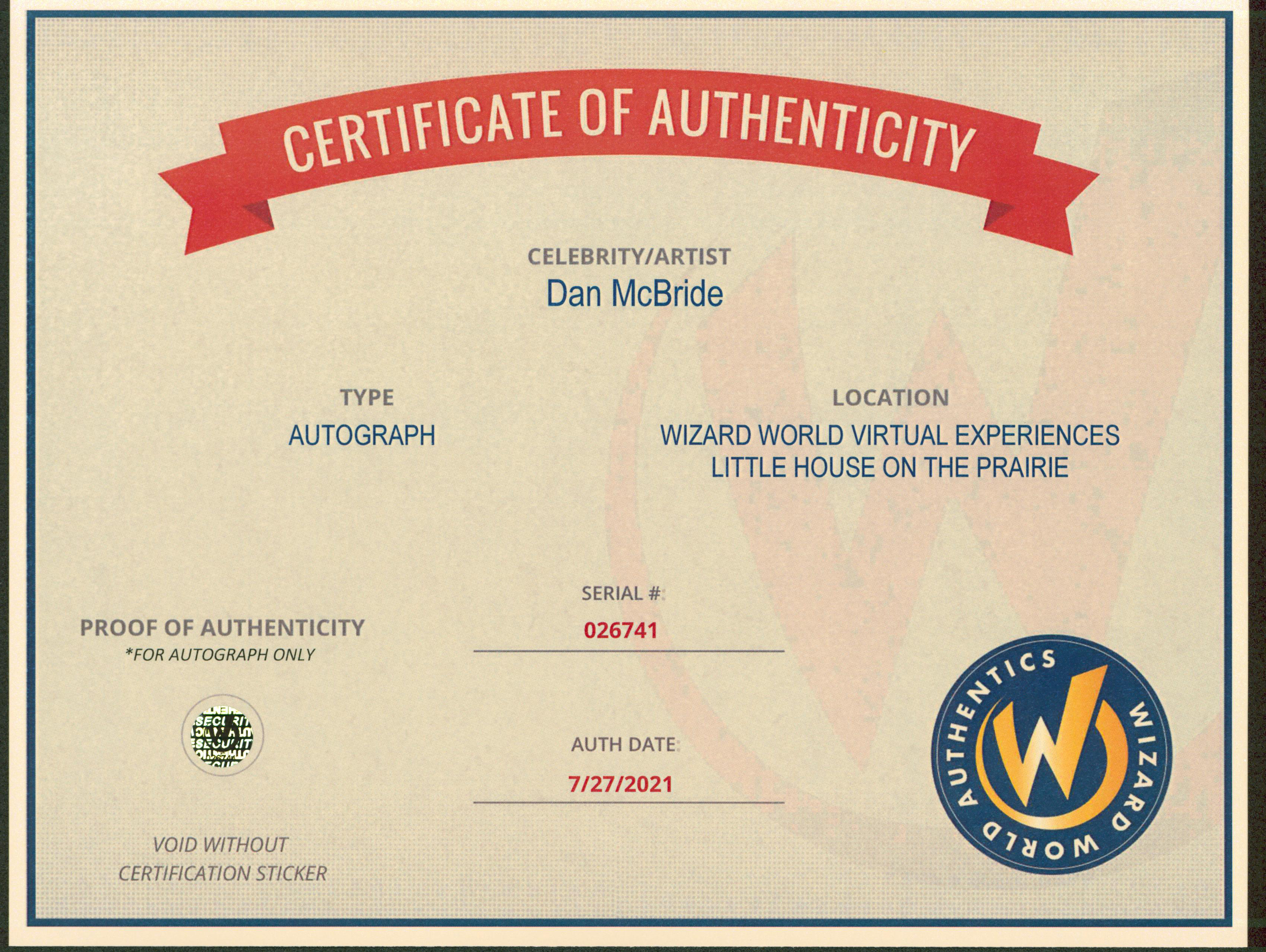 This Autographed 8x10 Photo has been Personally Signed by Dan McBride of Little House on the Prairie. This item is 100% Authentic to include a Certificate of Authenticity (COA) / hologram by Wizard World Authentics. A Wizard World Authentics representative was present when this item was being signed, the date of the signing is notated on the COA. We have multiples of this same item. While the photographs are representative of this item, the size, placement and strength of the signature may vary. Each item is hand signed, therefore, each autograph is unique.
