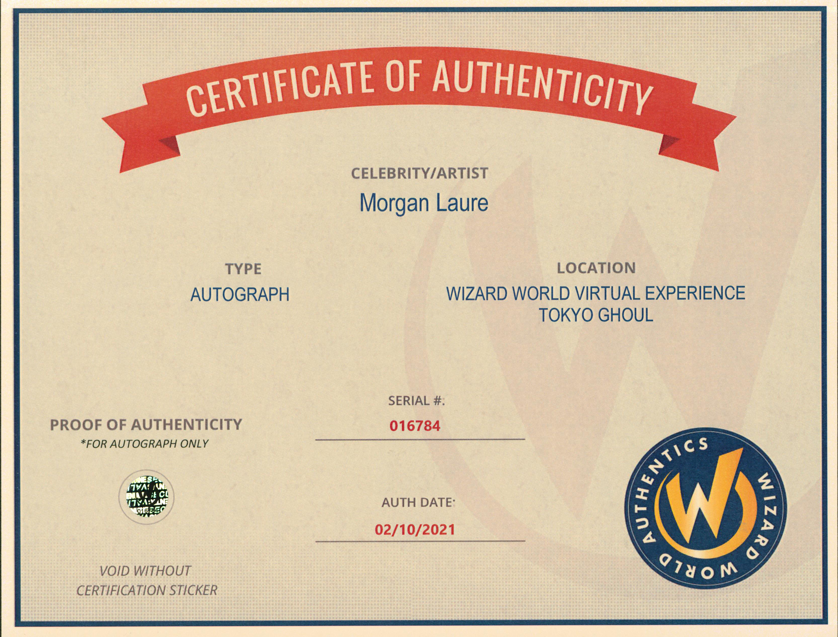 This Autographed 8x10 Photo has been Personally Signed by Morgan Laure of Tokyo Ghoul. This item is 100% Authentic to include a Certificate of Authenticity (COA) / hologram by Wizard World Authentics. A Wizard World Authentics representative was present when this item was being signed, the date of the signing is notated on the COA. We have multiples of this same item. While the photographs are representative of this item, the size, placement and strength of the signature may vary. Each item is hand signed, therefore, each autograph is unique.