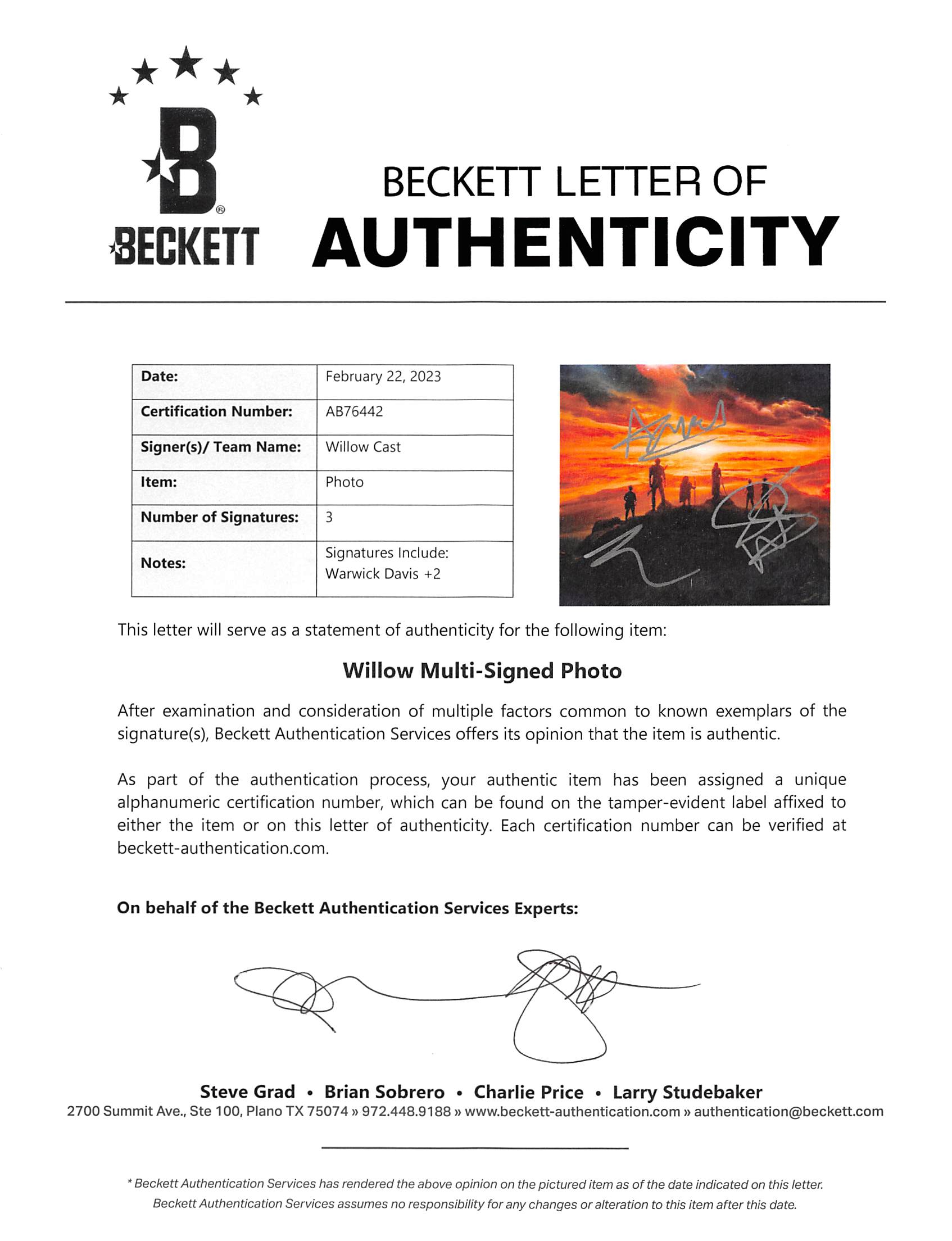 This Autographed 8x10 Photo has been Personally Signed by Warwick Davis, Chada Patel & Dempsey Bryk of Willow. This item is 100% Authentic to include a Certificate of Authenticity (COA) / hologram by Beckett Authentication Services. The authenticity can be verified on Beckett Authentication Services website.