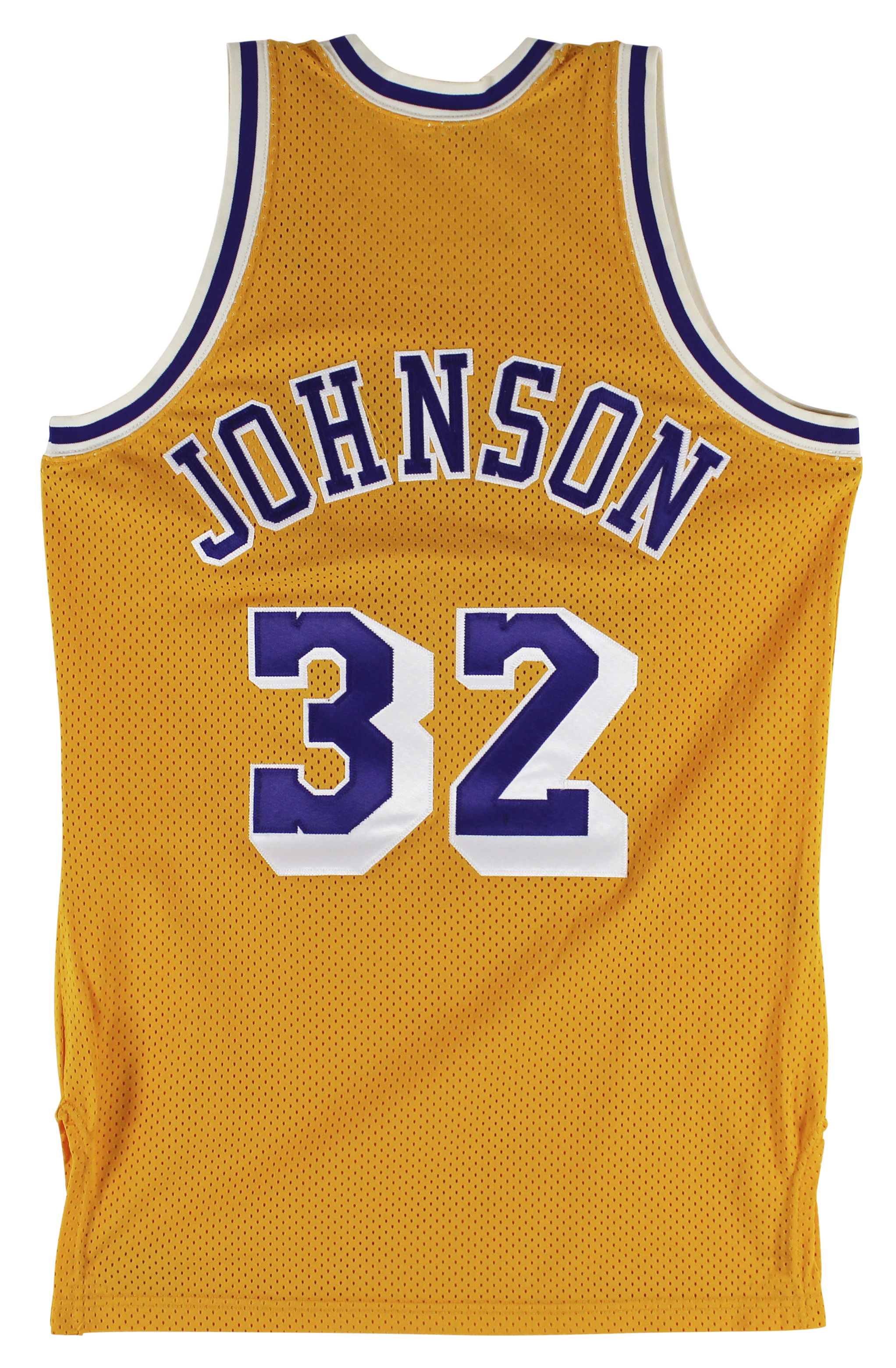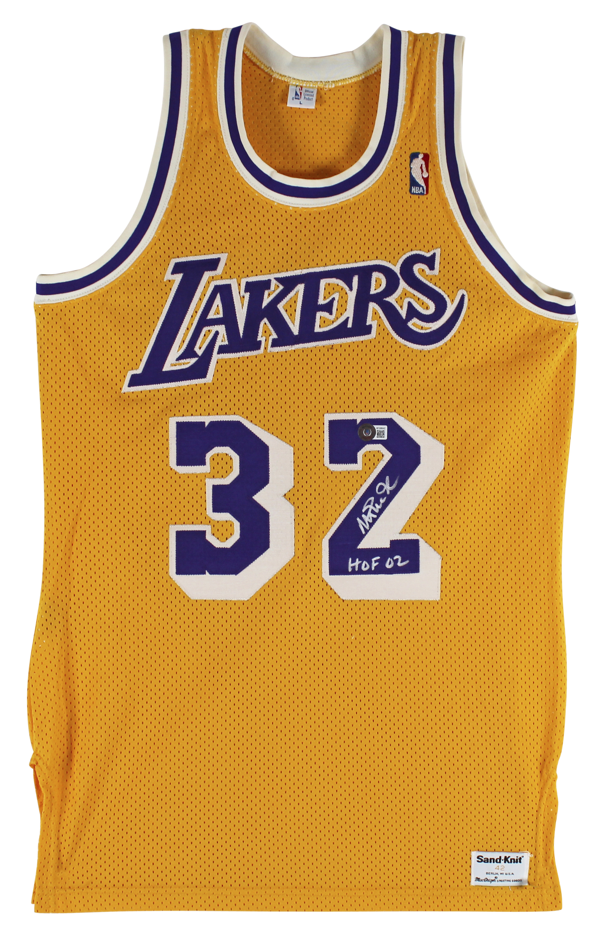 This Autographed Yellow Vintage MacGregor Sand-Knit Jersey with the inscription of "HOF 02" has been Personally Signed by Magic Johnson of the Los Angeles Lakers. This item is 100% Authentic to include a Certificate of Authenticity (COA) / hologram by Beckett Authentication Services. This is a BAS Witnessed Protection Program item which means a Beckett Authentication Service representative was present when this item was being signed. The authenticity can be verified on Beckett Authentication Services website. This is a Medium sized Jersey.