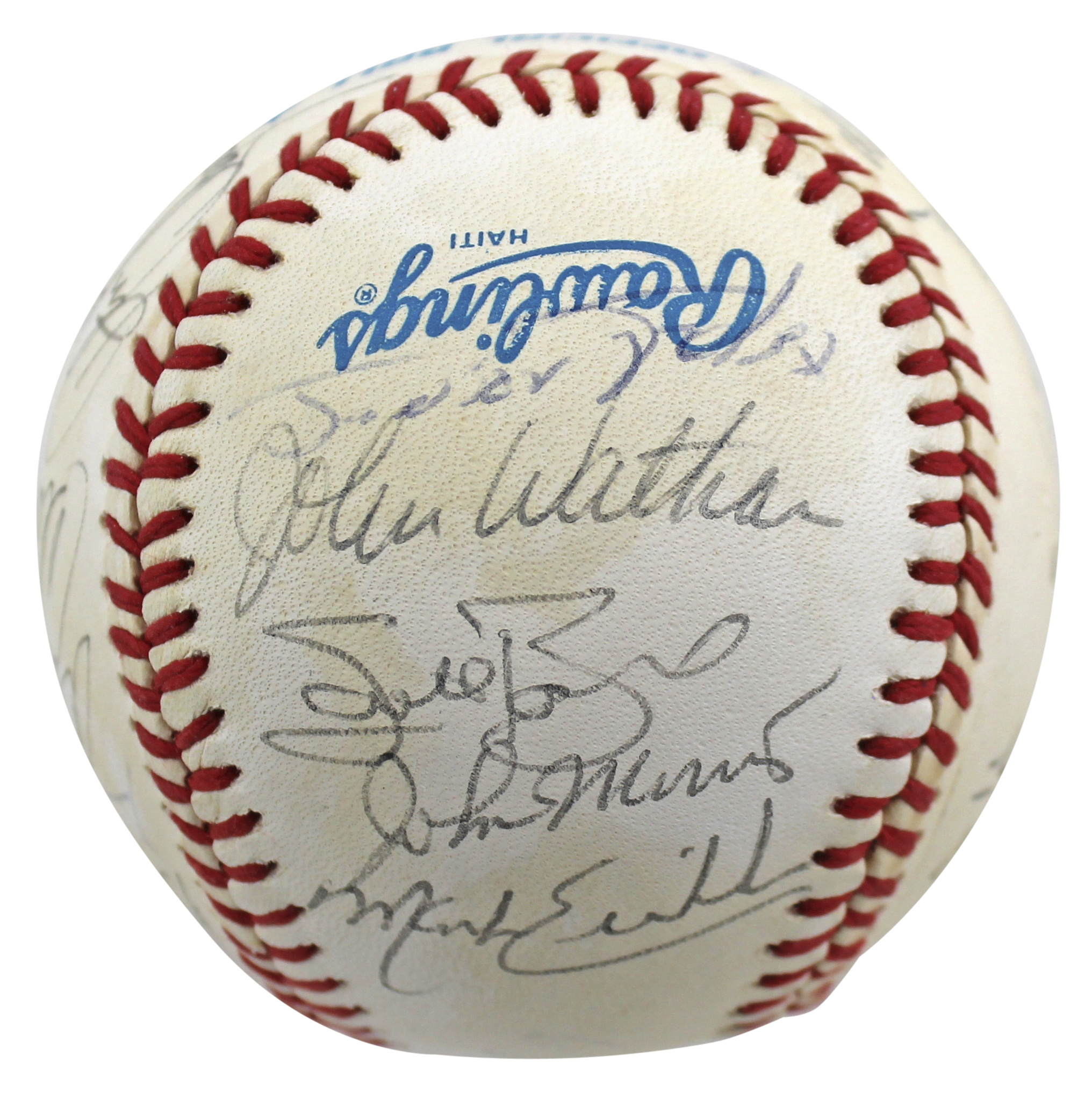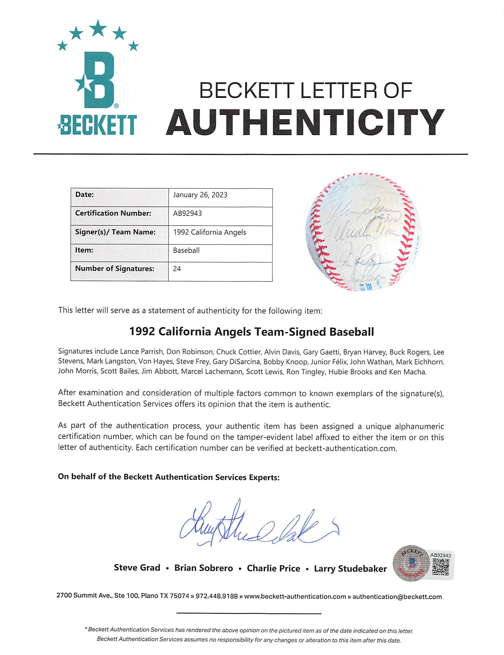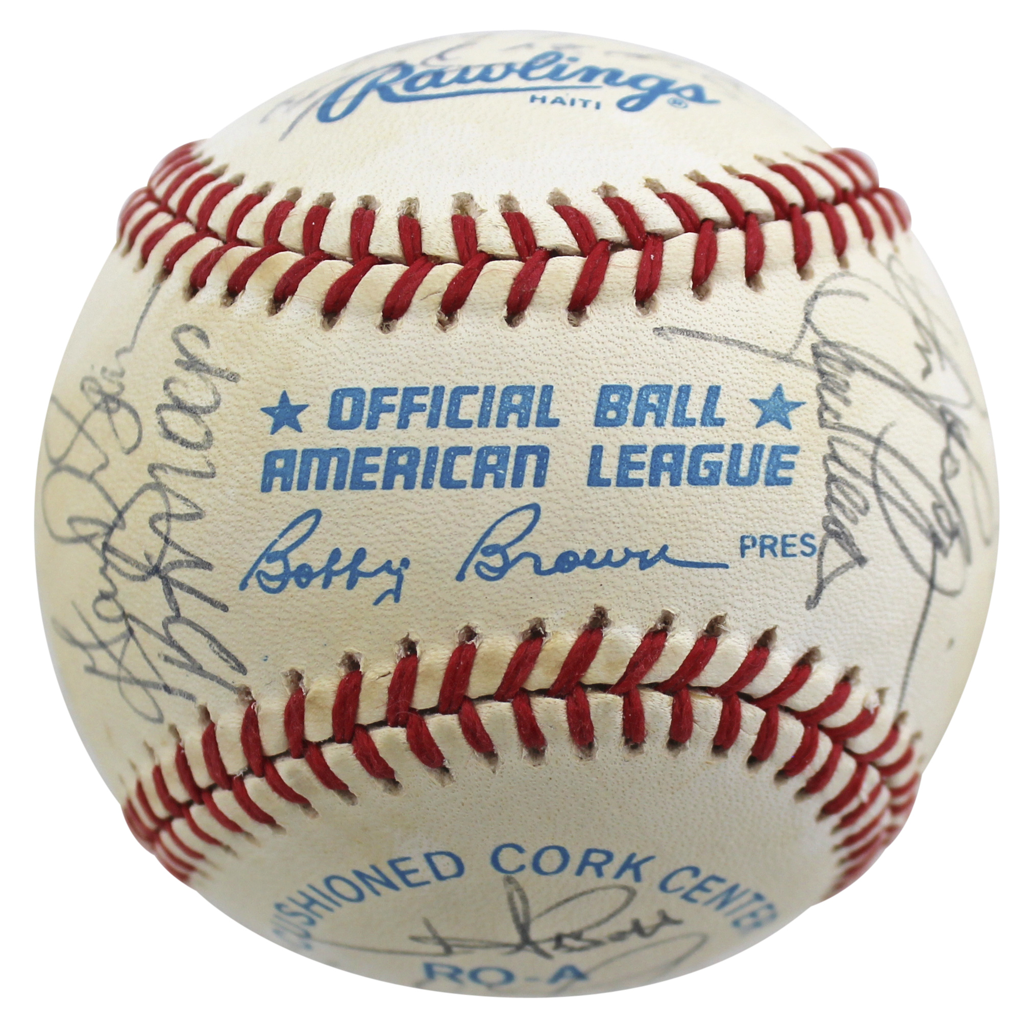 This Autographed Bobby Brown Oal Baseball has been Personally Signed by Lance Parrish, Don Robinson, Chuck Cottier, Alvin Davis, Gary Gaetti, Bryan Harvey, Buck Rogers, Lee Stevens, Mark Langston, Von Hayes, Steve Frey, Gary DiSarcina, Bobby Knoop, Junior F��lix, John Wathan, Mark Eichhorn, John Morris, Scott Bailes, Jim Abbott, Marcel Lachemann, Scott Lewis, Ron Tingley, Hubie Brooks and Ken Macha of the Los Angeles Angels. This item is 100% Authentic to include a Certificate of Authenticity (COA) / hologram by Beckett Authentication Services. The authenticity can be verified on Beckett Authentication Services website.