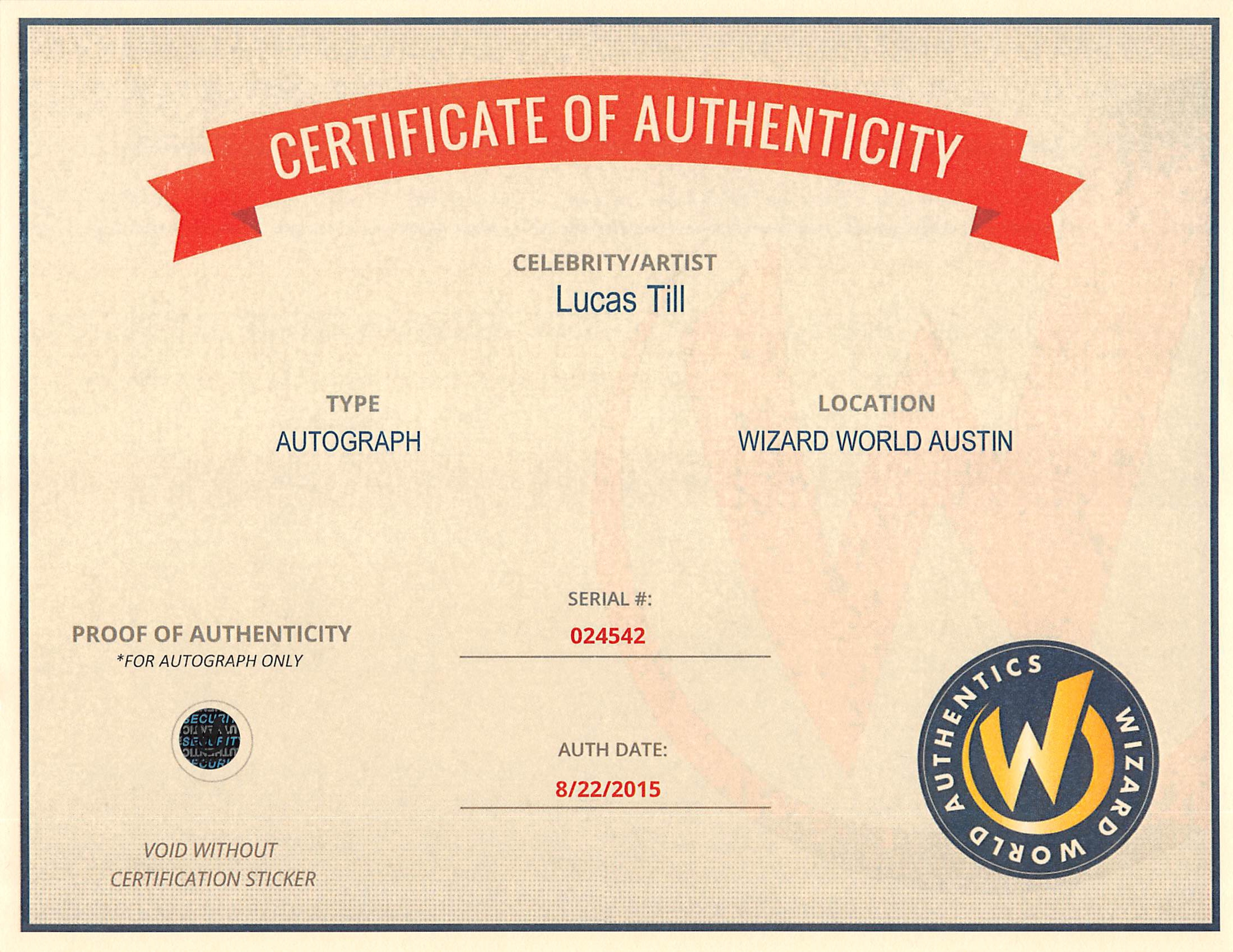 This Autographed 8x10 Photo has been Personally Signed by Lucas Till of MacGyver. This item is 100% Authentic to include a Certificate of Authenticity (COA) / hologram by Wizard World Authentics. A Wizard World Authentics representative was present when this item was being signed, the date of the signing is notated on the COA. We have multiples of this same item. While the photographs are representative of this item, the size, placement and strength of the signature may vary. Each item is hand signed, therefore, each autograph is unique.