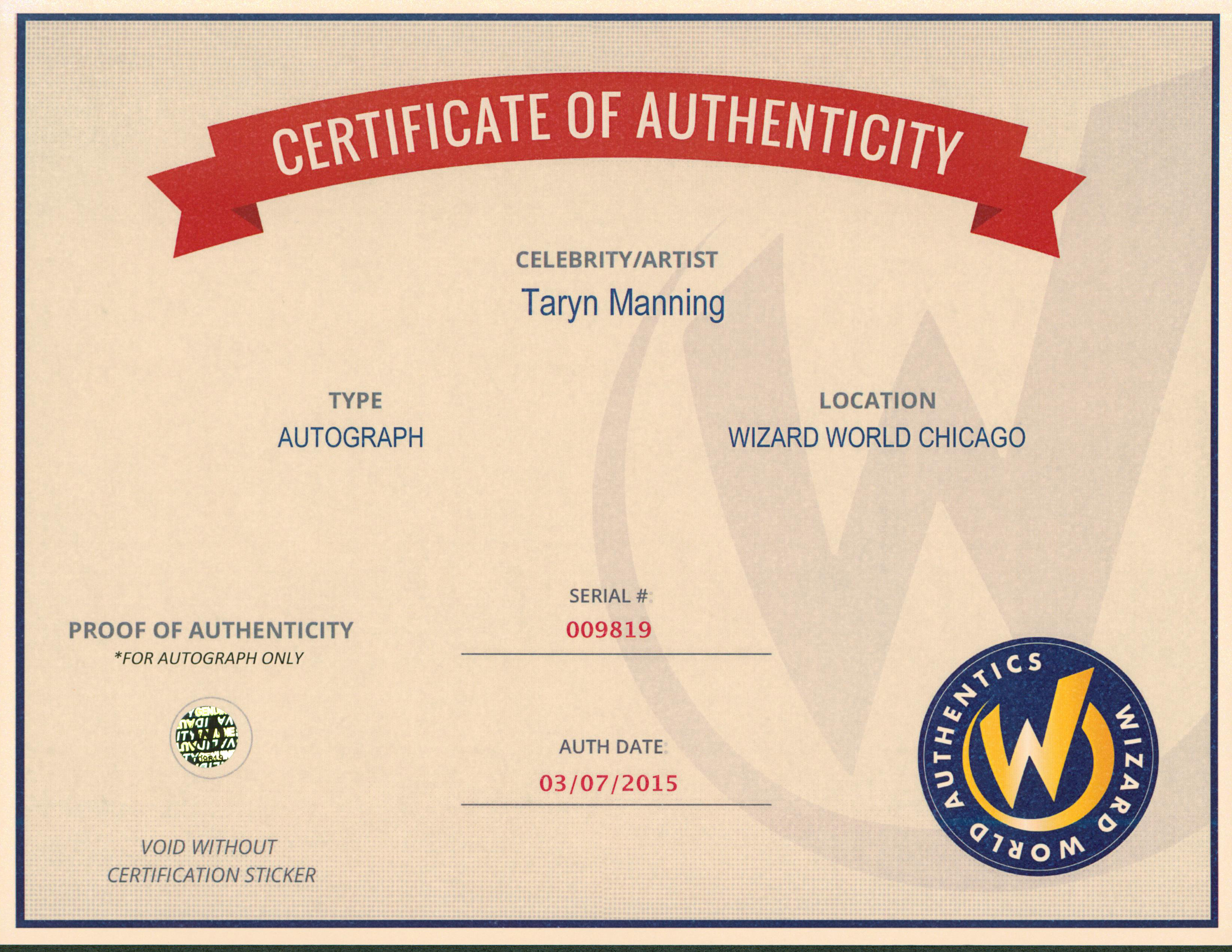 This Autographed 8x10 Photo has been Personally Signed by Taryn Manning of Orange is the New Black. This item is 100% Authentic to include a Certificate of Authenticity (COA) / hologram by Wizard World Authentics. A Wizard World Authentics representative was present when this item was being signed, the date of the signing is notated on the COA. We have multiples of this same item. While the photographs are representative of this item, the size, placement and strength of the signature may vary. Each item is hand signed, therefore, each autograph is unique. The signature may be Black or Gold.