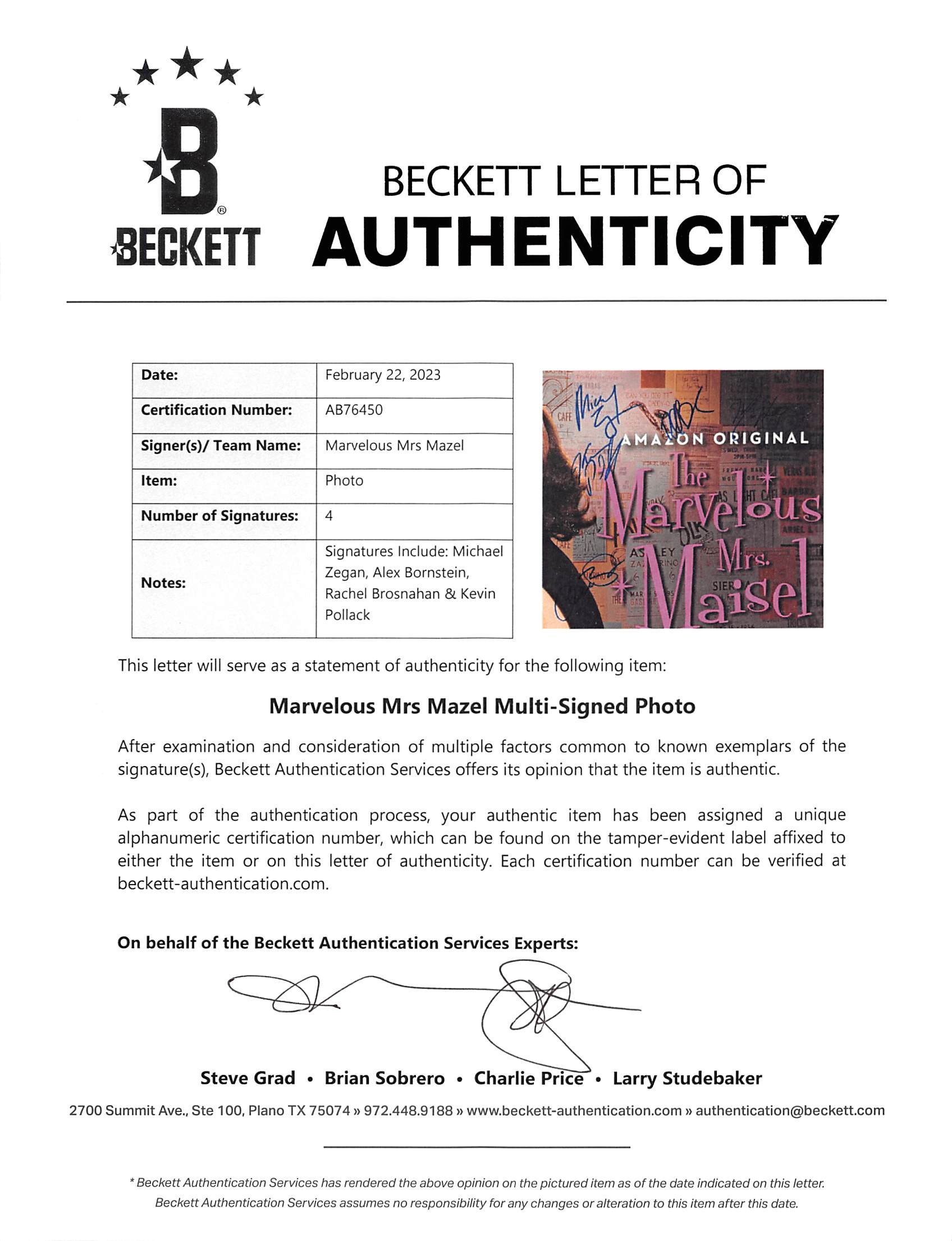 This Autographed 12x18 Photo has been Personally Signed by Michael Zegan, Alex Bornstein, Rachel Brosnahan & Kevin Pollack of The Marvelous Mrs. Maisel. This item is 100% Authentic to include a Certificate of Authenticity (COA) / hologram by Beckett Authentication Services. The authenticity can be verified on Beckett Authentication Services website.