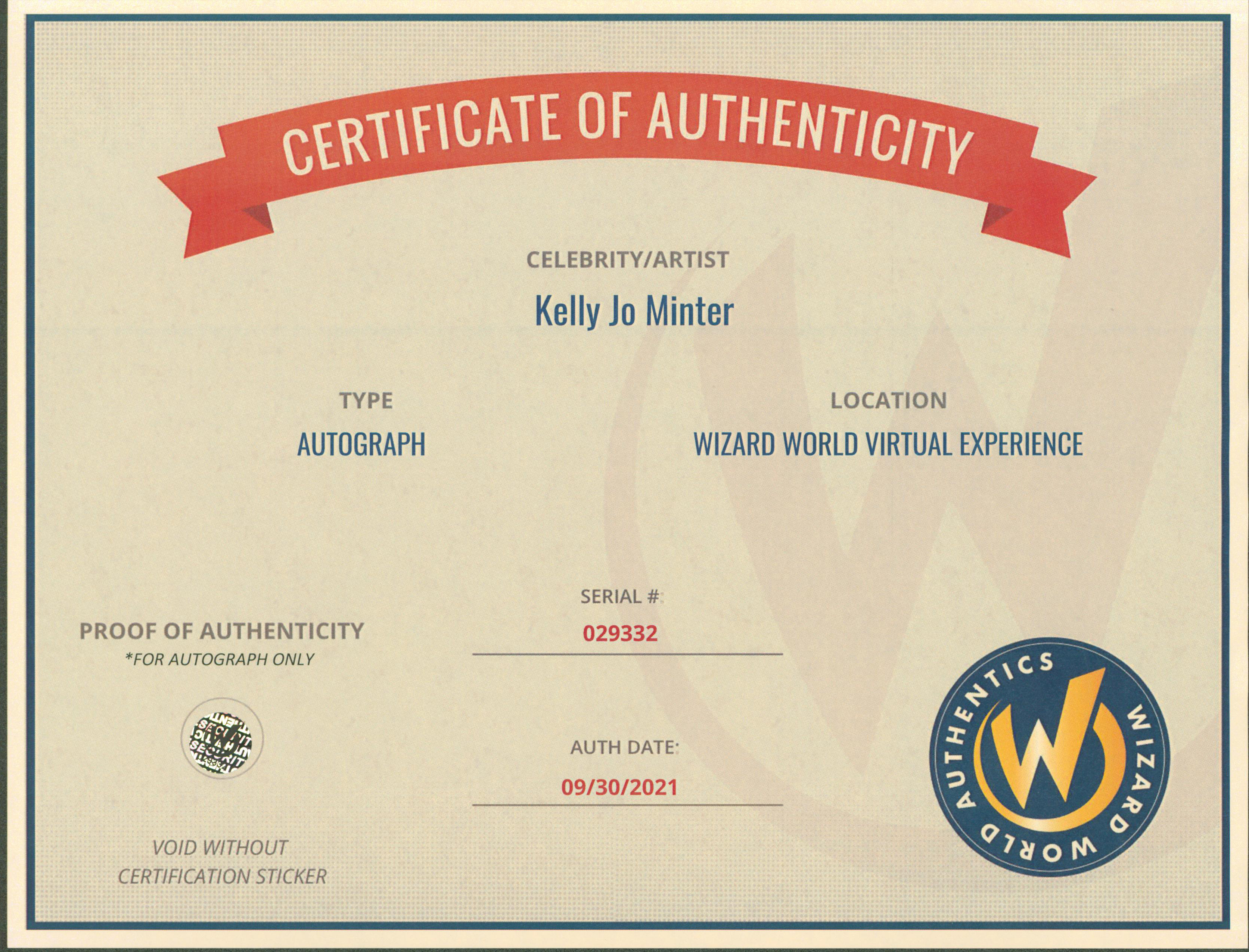 This Autographed 8x10 Photo has been Personally Signed by Kelly Jo Minter of A Nightmare On Elm Street. This item is 100% Authentic to include a Certificate of Authenticity (COA) / hologram by Wizard World Authentics. A Wizard World Authentics representative was present when this item was being signed, the date of the signing is notated on the COA. We have multiples of this same item. While the photographs are representative of this item, the size, placement and strength of the signature may vary. Each item is hand signed, therefore, each autograph is unique.