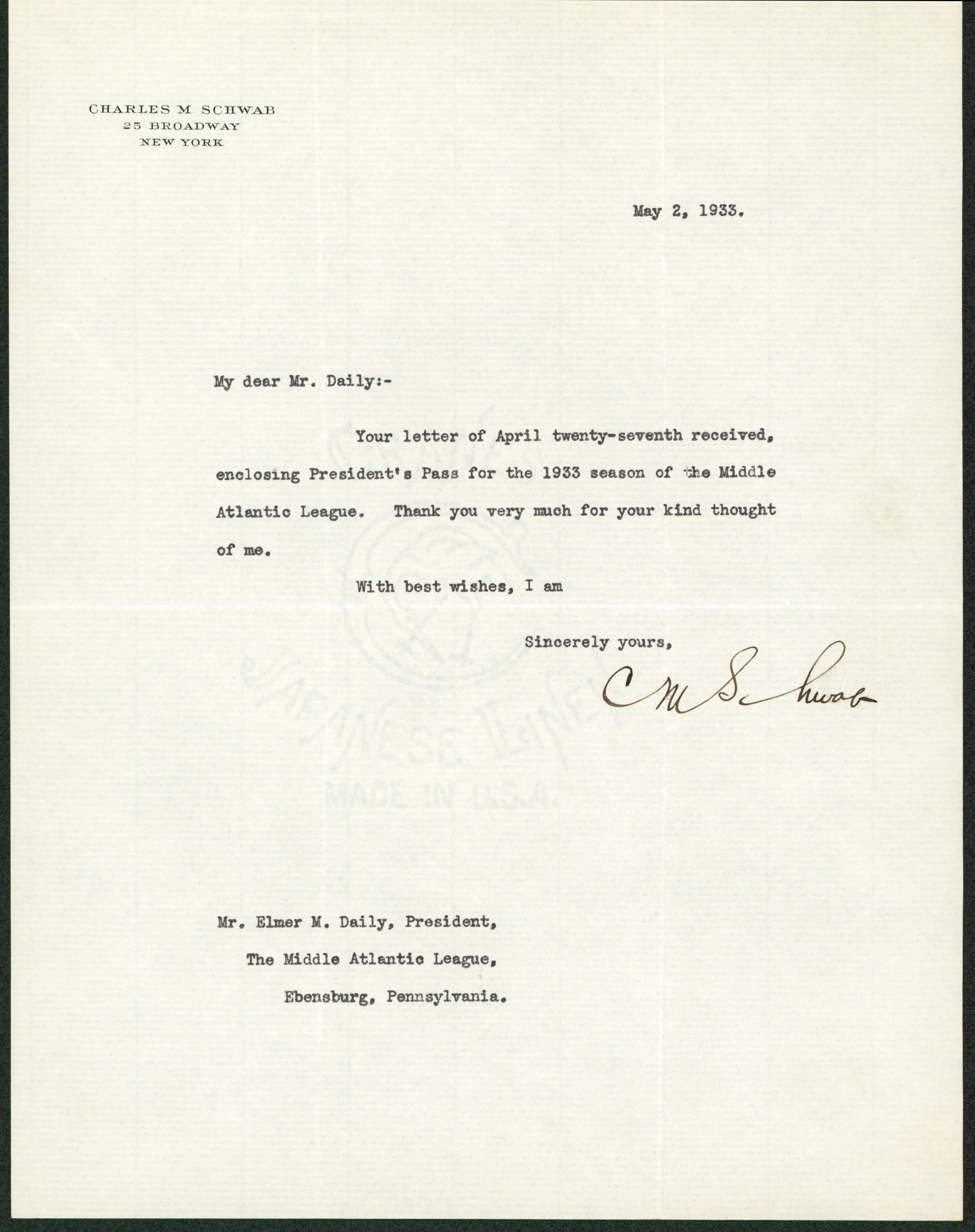 This Autographed Dated May 2, 1933 8.5x11 Letter has been Personally Signed by Charles Schwab. This item is 100% Authentic to include a Certificate of Authenticity (COA) / hologram by Beckett Authentication Services. The authenticity can be verified on Beckett Authentication Services website.