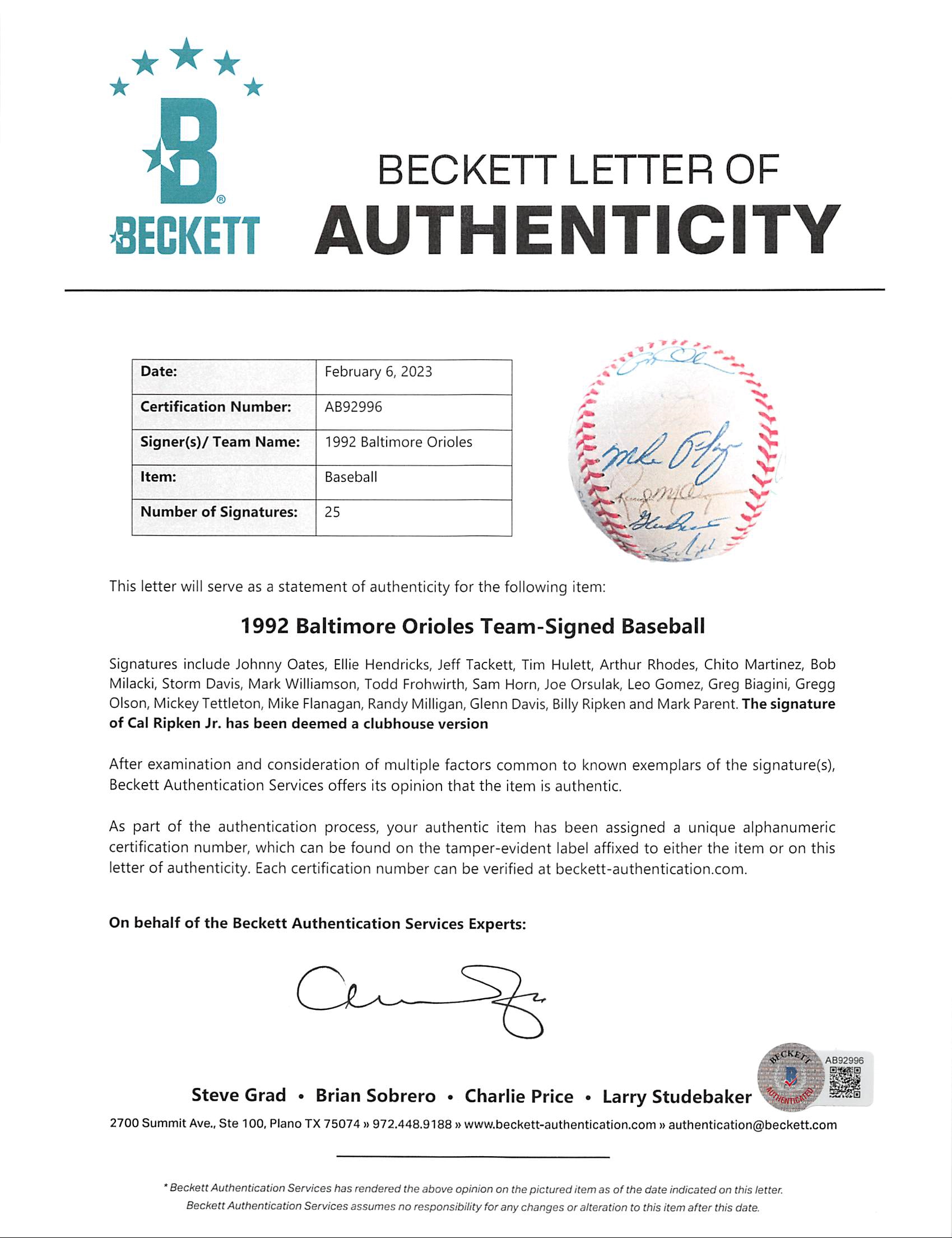 This Autographed Bobby Brown Oal Baseball has been Personally Signed by Johnny Oates, Ellie Hendricks, Jeff Tackett, Tim Hulett, Arthur Rhodes, Chito Martinez, Bob Milacki, Storm Davis, Mark Williamson, Todd Frohwirth, Sam Horn, Joe Orsulak, Leo Gomez, Greg Biagini, Gregg Olson, Mickey Tettleton, Mike Flanagan, Randy Milligan, Glenn Davis, Billy Ripken and Mark Parent. The signature of Cal Ripken Jr. has been deemed a clubhouse version of the Baltimore Orioles. This item is 100% Authentic to include a Certificate of Authenticity (COA) / hologram by Beckett Authentication Services. The authenticity can be verified on Beckett Authentication Services website.