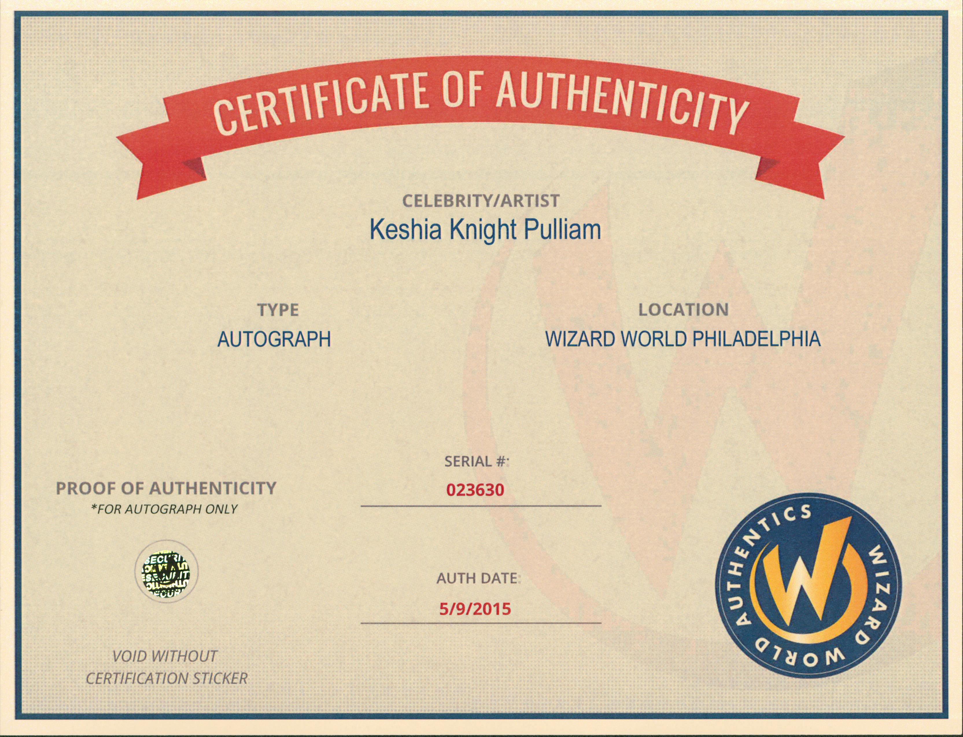 This Autographed 8x10 Photo has been Personally Signed by Keshia Knight Pulliam of The Cosby Show. This item is 100% Authentic to include a Certificate of Authenticity (COA) / hologram by Wizard World Authentics. A Wizard World Authentics representative was present when this item was being signed, the date of the signing is notated on the COA. We have multiples of this same item. While the photographs are representative of this item, the size, placement and strength of the signature may vary. Each item is hand signed, therefore, each autograph is unique.