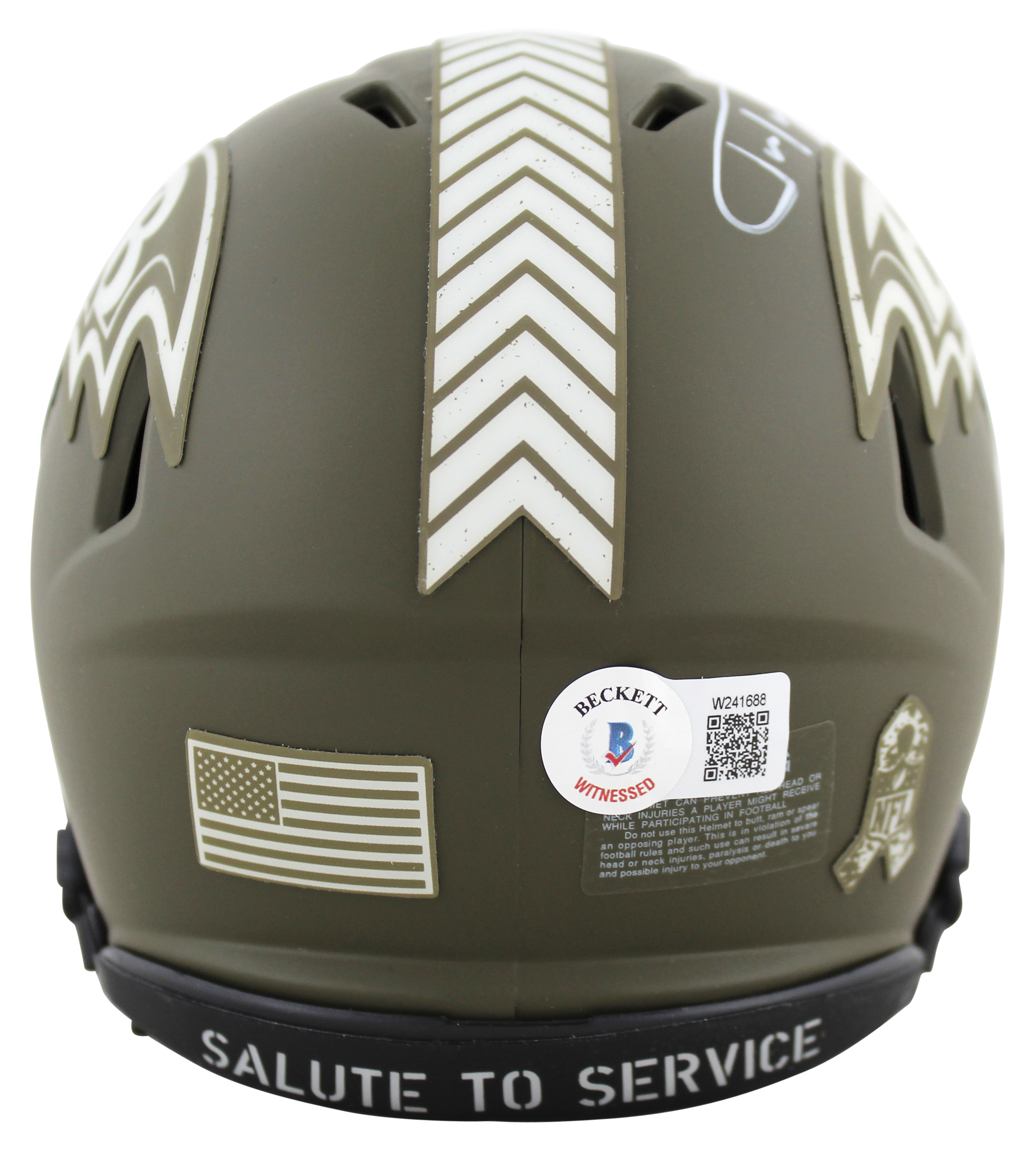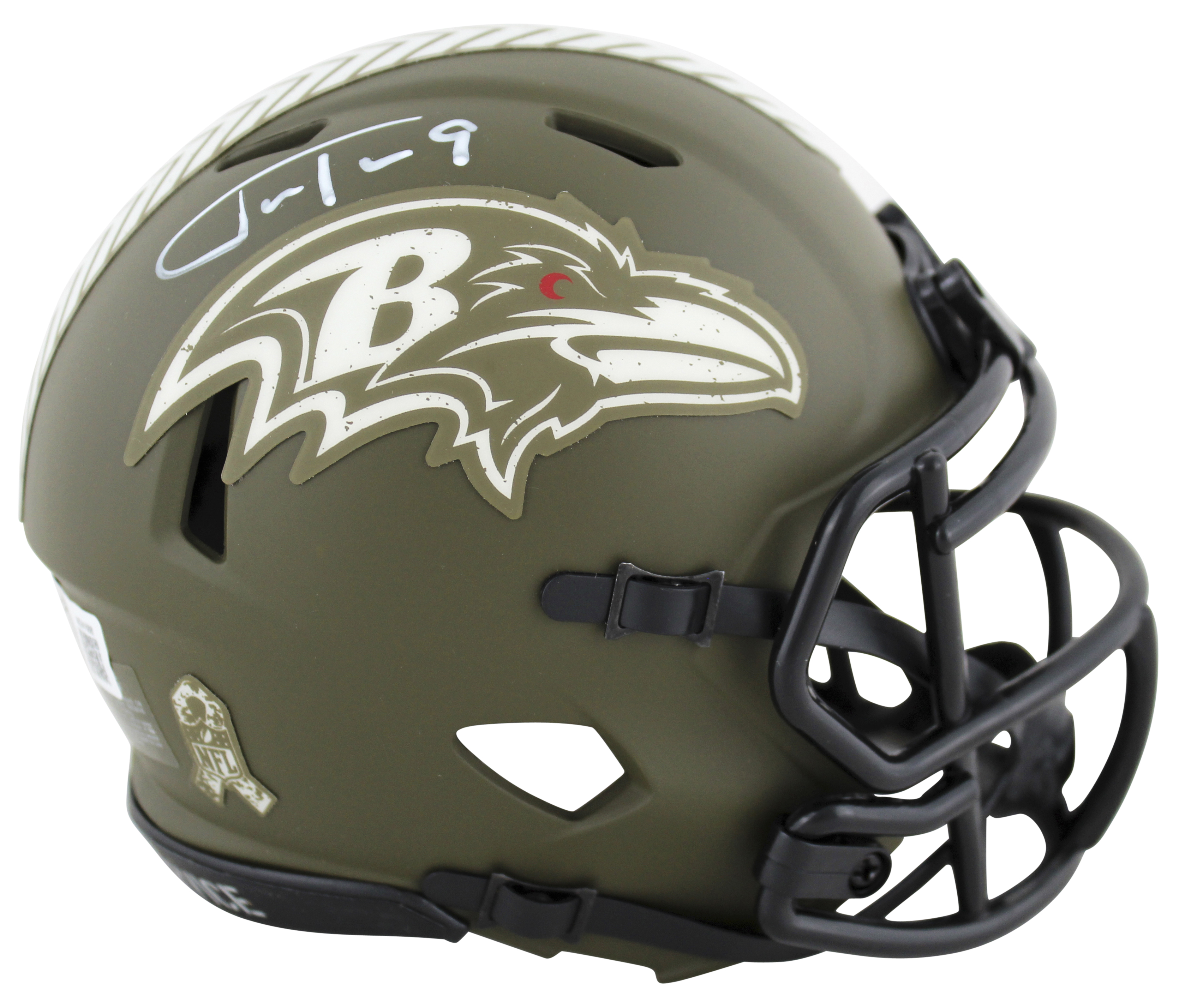 This Autographed Alternate Salute To Service Speed Mini Helmet has been Personally Signed by Justin Tucker of the Baltimore Ravens. This item is 100% Authentic to include a hologram by Beckett Authentication Services. This item will come with an affixed Beckett Authentication Services (BAS) authentication sticker, which includes a scannable QR code to verify authenticity. Please note that Beckett no longer provides serial-numbered COA cards, and the attached BAS sticker will serve as the complete authentication for this item. This is a BAS Witnessed Protection Program item which means a Beckett Authentication Service representative was present when this item was being signed. We conducted an autograph signing with Justin Tucker where multiples of the same item were signed. While the photographs are representative of this item, the size, placement and strength of the signature may vary. Each item is hand signed, therefore, each autograph is unique. This item can be verified through BAS Witnessed.