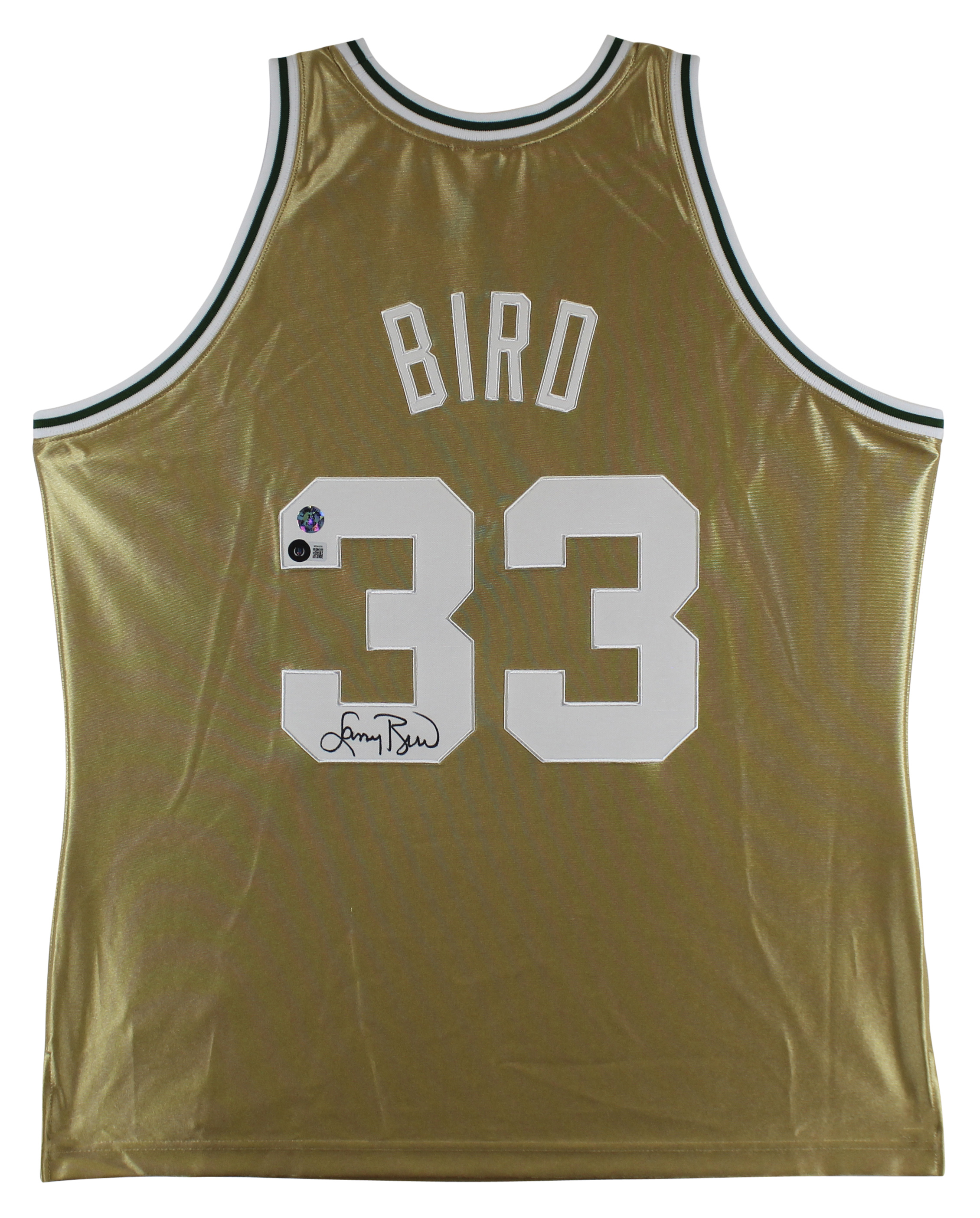 This Autographed Gold 75th Anniversary Mitchell & Ness Hardwood Classics Swingman Jersey has been Personally Signed by Larry Bird of the Boston Celtics. This item is 100% Authentic to include a hologram by Beckett Authentication Services. This item will come with an affixed Beckett Authentication Services (BAS) authentication sticker, which includes a scannable QR code to verify authenticity. Please note that Beckett no longer provides serial-numbered COA cards, and the attached BAS sticker will serve as the complete authentication for this item. This is a BAS Witnessed Protection Program item which means a Beckett Authentication Service representative was present when this item was being signed. We conducted an autograph signing with Larry Bird where multiples of the same item were signed. While the photographs are representative of this item, the size, placement and strength of the signature may vary. Each item is hand signed, therefore, each autograph is unique. This item can be verified through BAS Witnessed. This is a X-Large sized Jersey.