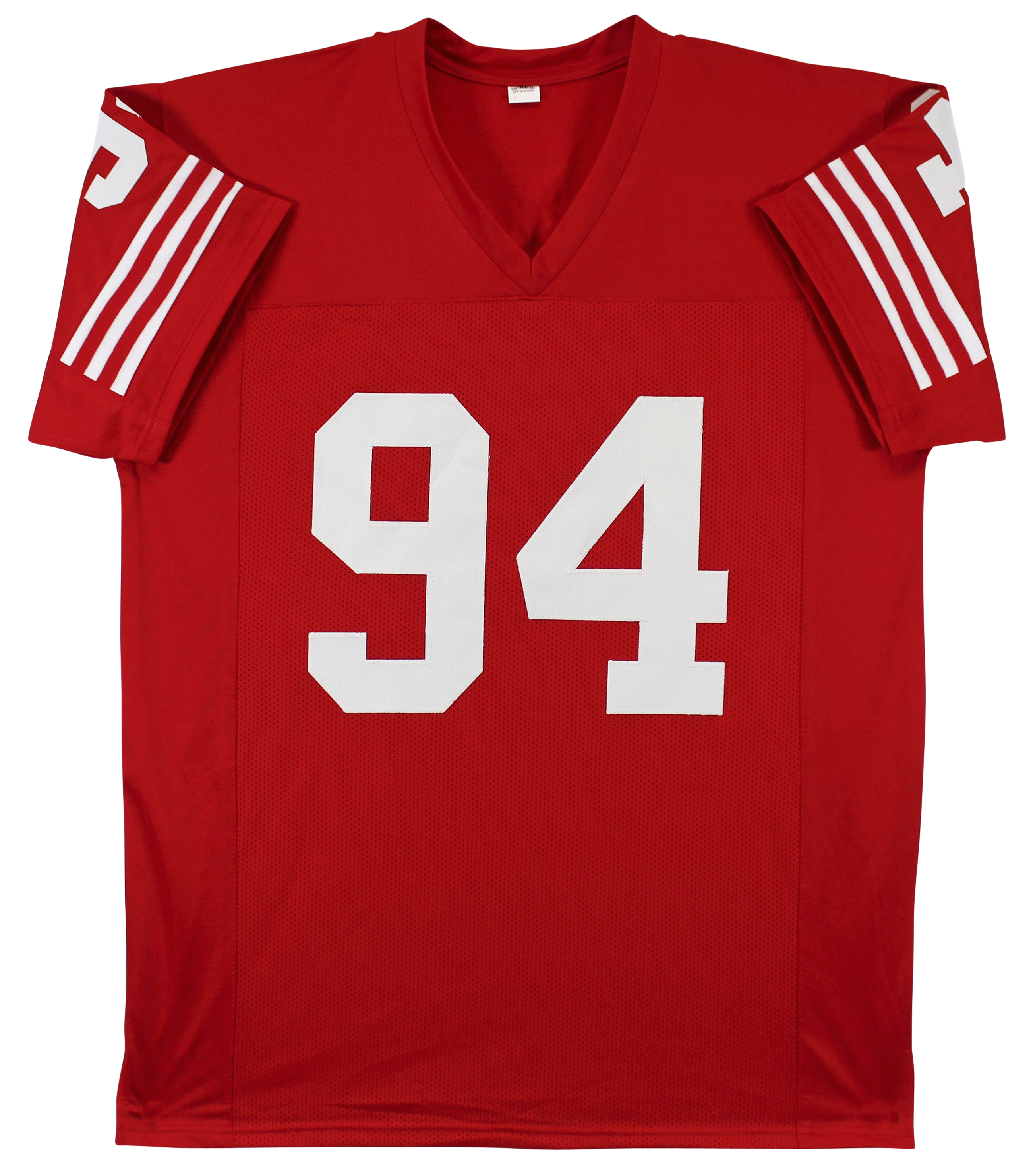 This Autographed Red Pro Style Jersey has been Personally Signed by Charles Haley of the San Francisco 49ers. This item is 100% Authentic to include a hologram by Beckett Authentication Services. This item will come with an affixed Beckett Authentication Services (BAS) authentication sticker, which includes a scannable QR code to verify authenticity. Please note that Beckett no longer provides serial-numbered COA cards, and the attached BAS sticker will serve as the complete authentication for this item. This is a BAS Witnessed Protection Program item which means a Beckett Authentication Service representative was present when this item was being signed. We conducted an autograph signing with Charles Haley where multiples of the same item were signed. While the photographs are representative of this item, the size, placement and strength of the signature may vary. Each item is hand signed, therefore, each autograph is unique. This item can be verified through BAS Witnessed. This is a X-Large sized, non-branded, custom-stitched Jersey.