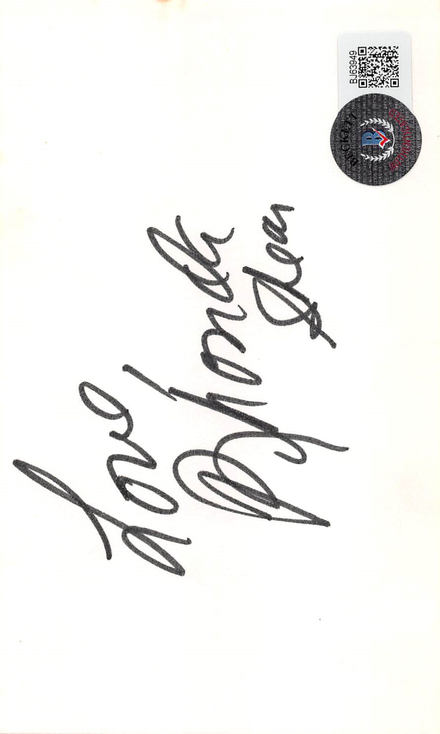 This Autographed 3x5 Index Card with the inscription of "Love" has been Personally Signed by Rhonda Shear of USA Up All Night. This item is 100% Authentic to include a hologram by Beckett Authentication Services. This item will come with an affixed Beckett Authentication Services (BAS) authentication sticker, which includes a scannable QR code to verify authenticity. Please note that Beckett no longer provides serial-numbered COA cards, and the attached BAS sticker will serve as the complete authentication for this item. The authenticity can be verified on Beckett Authentication Services website.