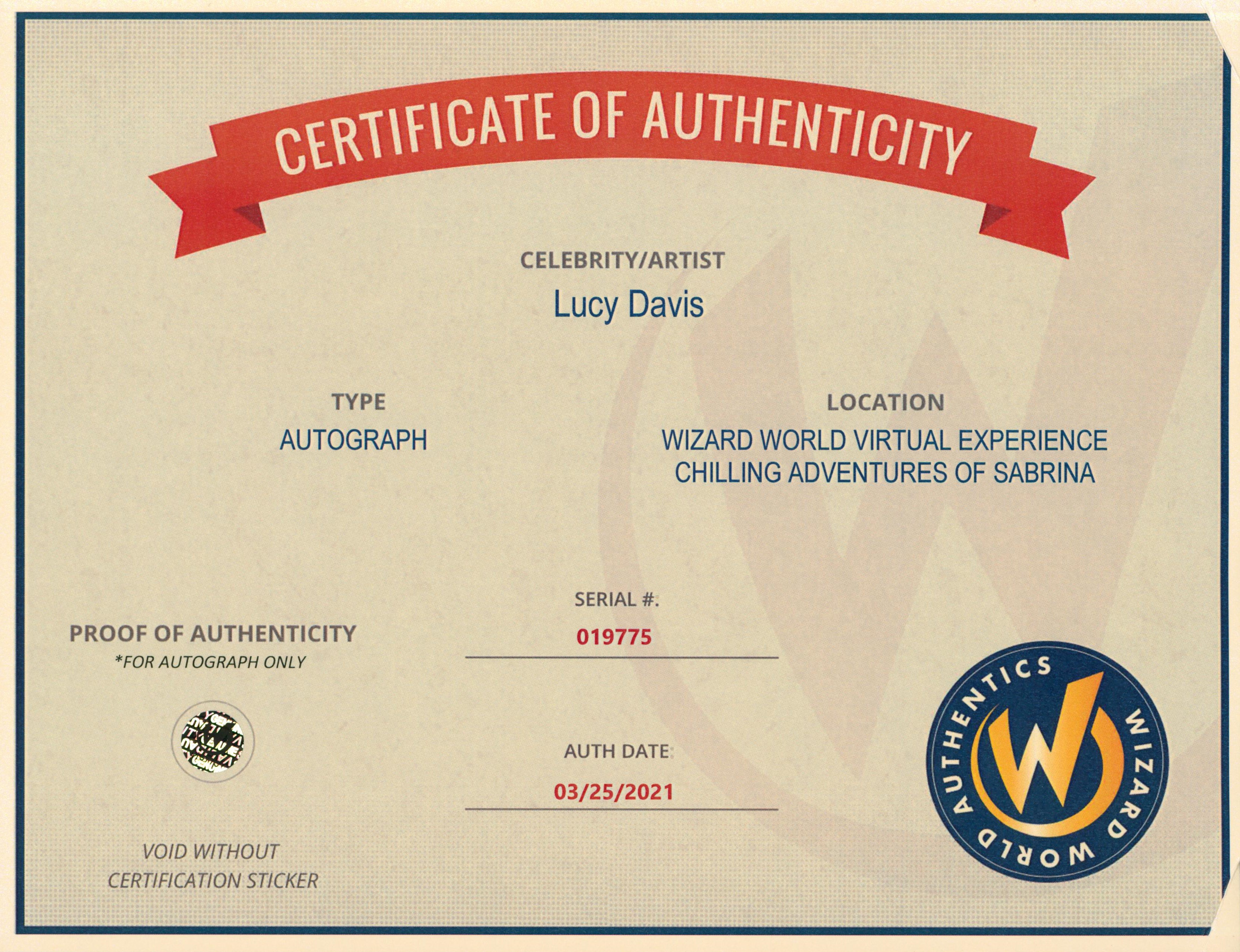 This Autographed 8x10 Photo has been Personally Signed by Lucy Davis of Chilling Adventures Of Sabrina. This item is 100% Authentic to include a Certificate of Authenticity (COA) / hologram by Wizard World Authentics. A Wizard World Authentics representative was present when this item was being signed, the date of the signing is notated on the COA. We have multiples of this same item. While the photographs are representative of this item, the size, placement and strength of the signature may vary. Each item is hand signed, therefore, each autograph is unique.