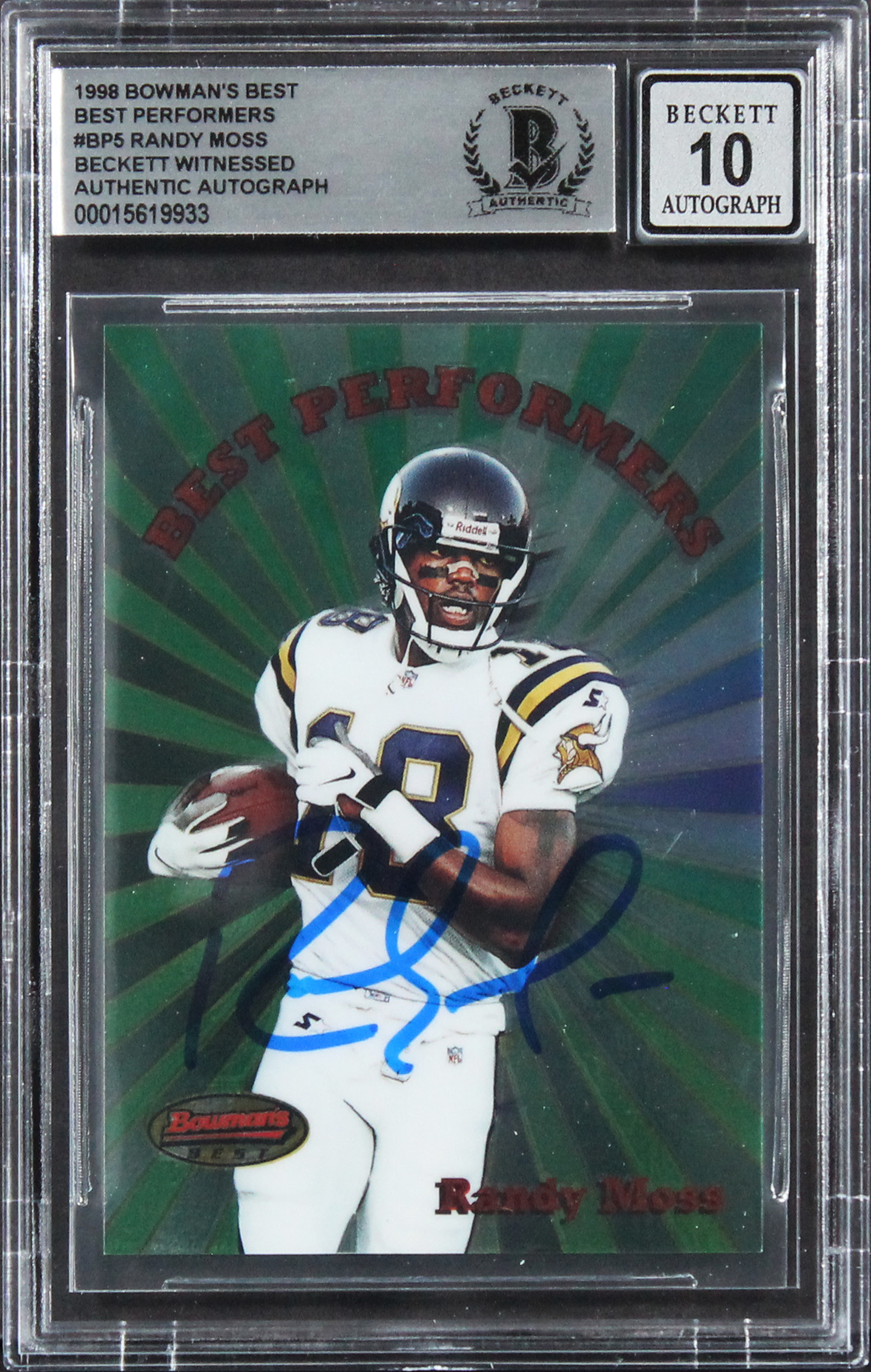 This Autographed Auto Graded Gem Mint 10! 1998 Bowman's Best Best Performers #BP5 Card has been Personally Signed by Randy Moss of the Minnesota Vikings. This item is 100% Authentic, it comes slabbed and authenticated by Beckett Authentication Services. The authenticity can be verified on Beckett Authentication Services website.