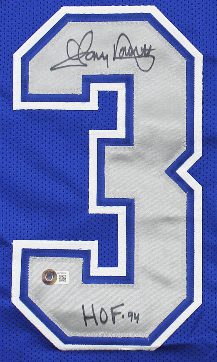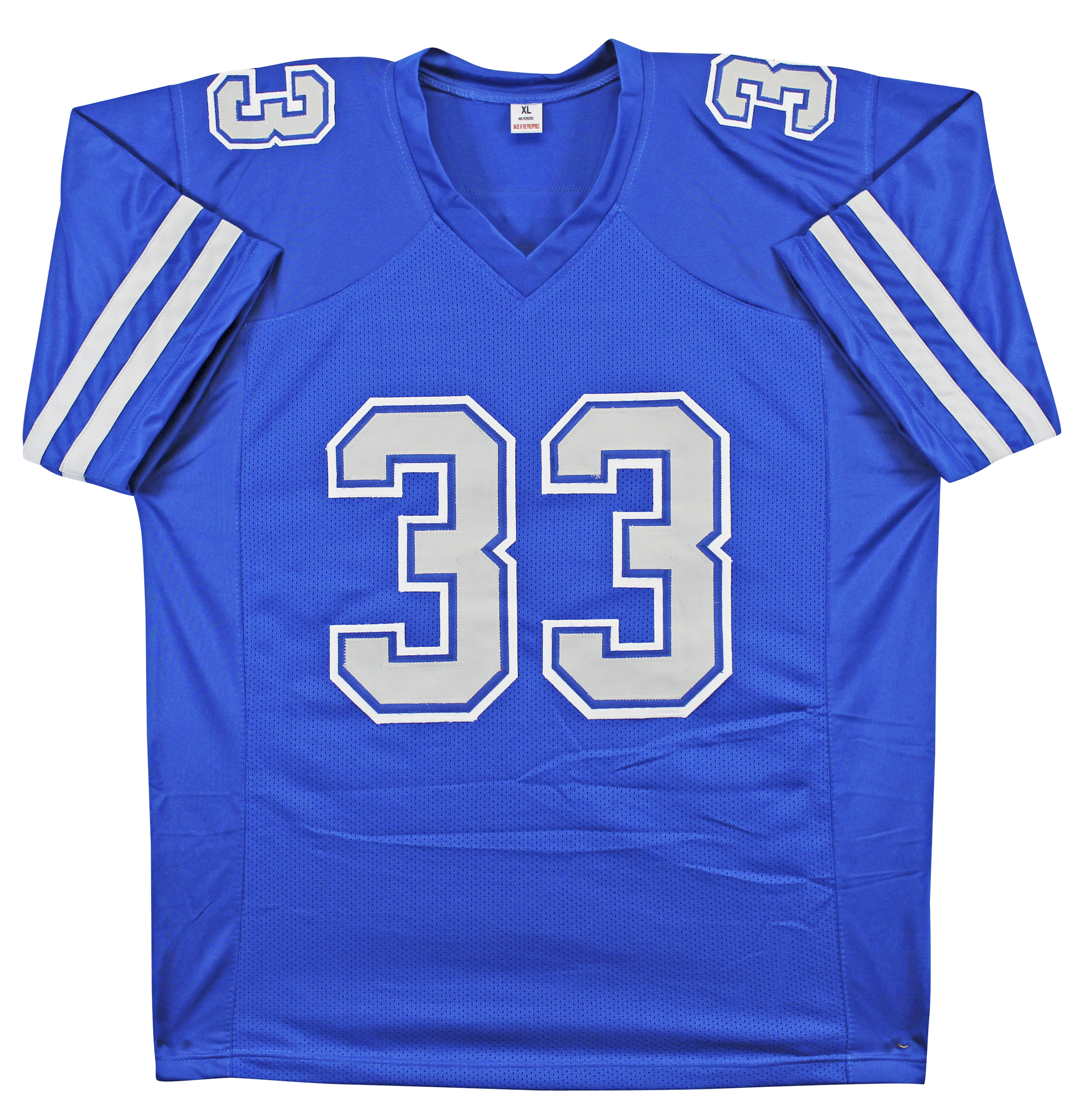 This Autographed Blue Throwback Pro Style Jersey with the inscription of "HOF 94" has been Personally Signed by Tony Dorsett of the Dallas Cowboys. This item is 100% Authentic to include a hologram by Beckett Authentication Services. This item will come with an affixed Beckett Authentication Services (BAS) authentication sticker, which includes a scannable QR code to verify authenticity. Please note that Beckett no longer provides serial-numbered COA cards, and the attached BAS sticker will serve as the complete authentication for this item. This is a BAS Witnessed Protection Program item which means a Beckett Authentication Service representative was present when this item was being signed. We conducted an autograph signing with Tony Dorsett where multiples of the same item were signed. While the photographs are representative of this item, the size, placement and strength of the signature may vary. Each item is hand signed, therefore, each autograph is unique. This item can be verified through BAS Witnessed. This is a X-Large sized, non-branded, custom-stitched Jersey.