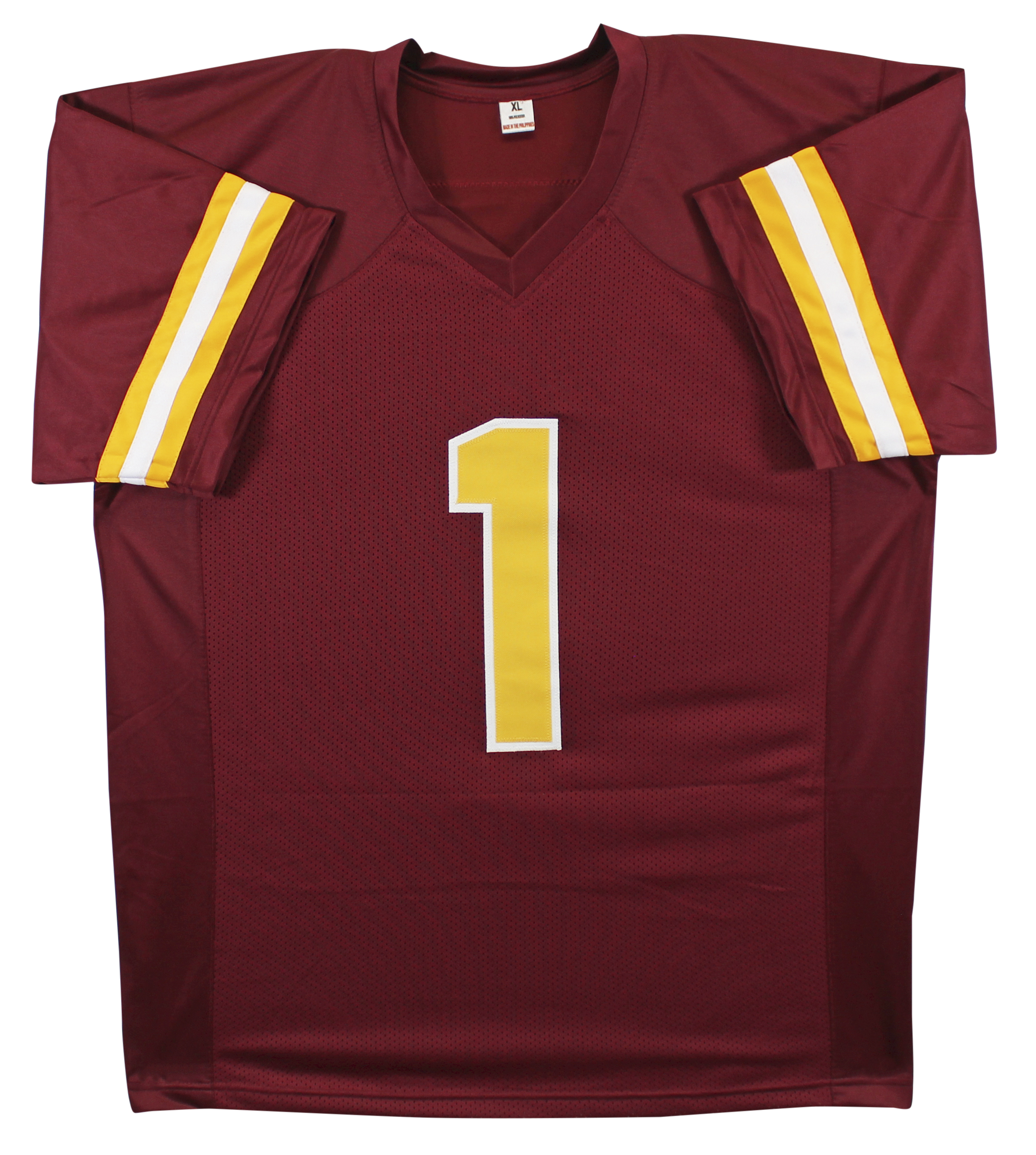 This Autographed w/ Yellow Numbers Maroon Pro Style Jersey has been Personally Signed by Jahan Dotson of the Washington Commanders. This item is 100% Authentic to include a Certificate of Authenticity (COA) / hologram by JSA. We conducted an autograph signing with Jahan Dotson where multiples of the same item were signed. While the photographs are representative of this item, the size, placement and strength of the signature may vary. Each item is hand signed, therefore, each autograph is unique. This item can be verified through JSA. This is a X-Large sized, non-branded, custom-stitched Jersey.