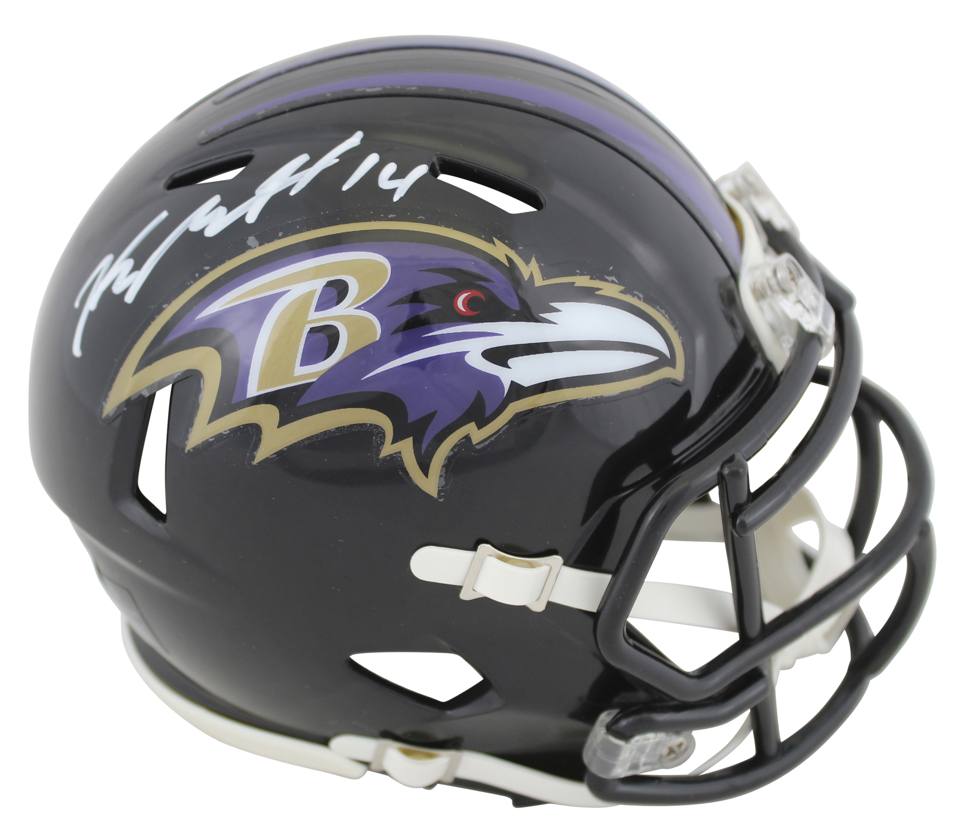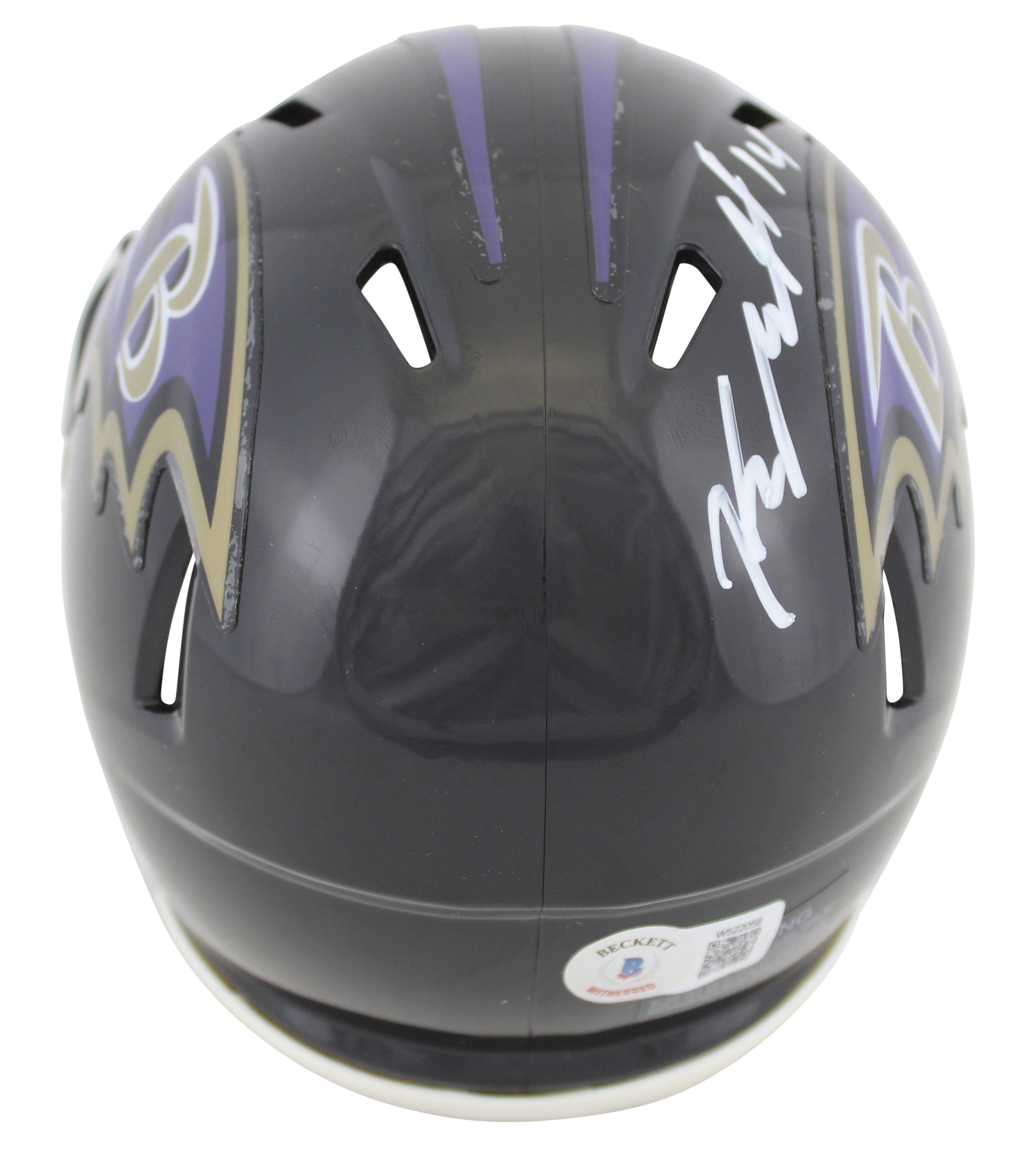 This Autographed w/ White Signature Speed Mini Helmet has been Personally Signed by Kyle Hamilton of the Baltimore Ravens. This item is 100% Authentic to include a hologram by Beckett Authentication Services. This item may come with the new Beckett Authentication hologram that has a scannable QR code rather than the traditional COA. If you would like to have a COA, you are welcome to reach out to Beckett for a printed certification once you receive your item. This is a BAS Witnessed Protection Program item which means a Beckett Authentication Service representative was present when this item was being signed. We conducted an autograph signing with Kyle Hamilton where multiples of the same item were signed. While the photographs are representative of this item, the size, placement and strength of the signature may vary. Each item is hand signed, therefore, each autograph is unique. This item can be verified through BAS Witnessed.