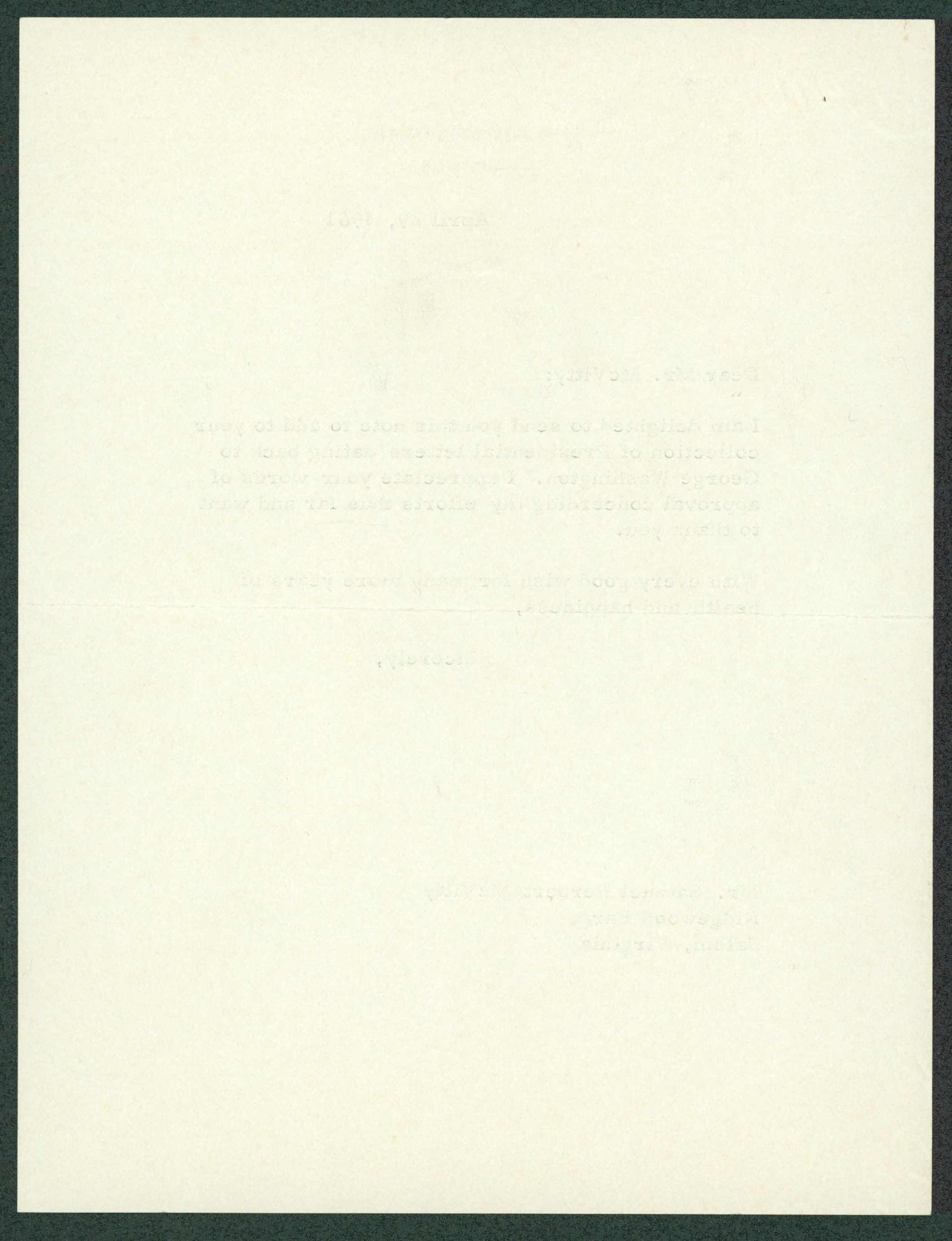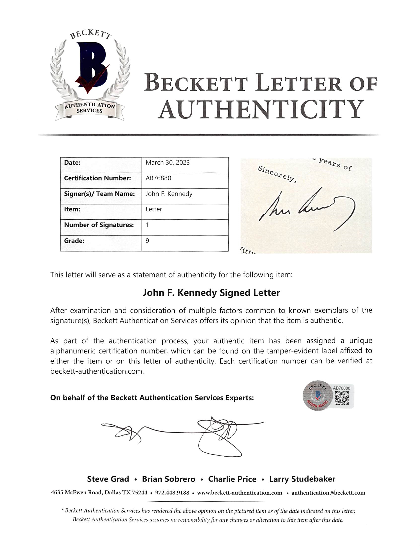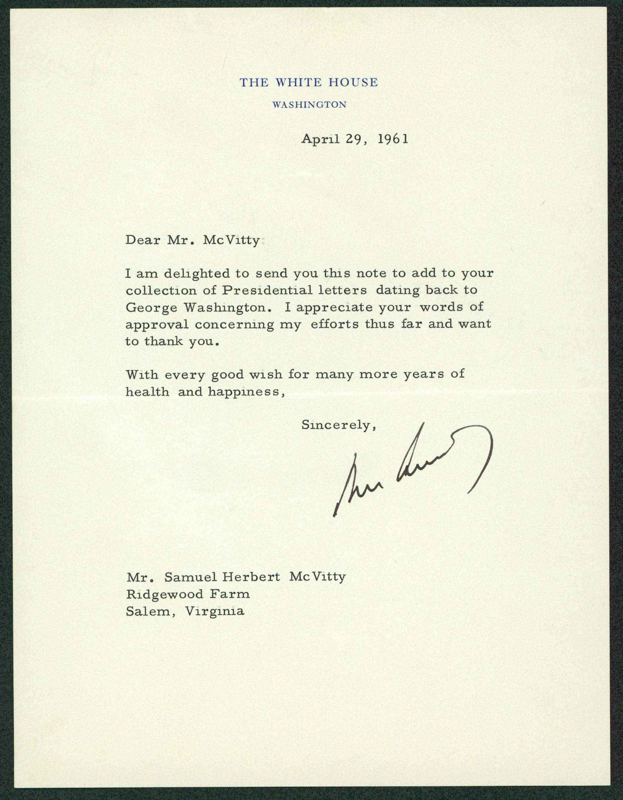 This Autographed Dated April 29, 1961 Auto Graded Mint 9! 6.75x8.75 Letter has been Personally Signed by John F. Kennedy. This item is 100% Authentic to include a hologram by Beckett Authentication Services. This item will come with an affixed Beckett Authentication Services (BAS) authentication sticker, which includes a scannable QR code to verify authenticity. Please note that Beckett no longer provides serial-numbered COA cards, and the attached BAS sticker will serve as the complete authentication for this item. The authenticity can be verified on Beckett Authentication Services website. On White House letterhead, April 29, 1961. Letter to Samuel Herbert McVitty, in part: "I am delighted to send you this note to add to your collection of Presidential letters dating back to George Washington. I appreciate your words of approval concerning my efforts thus far and want to thank you."
