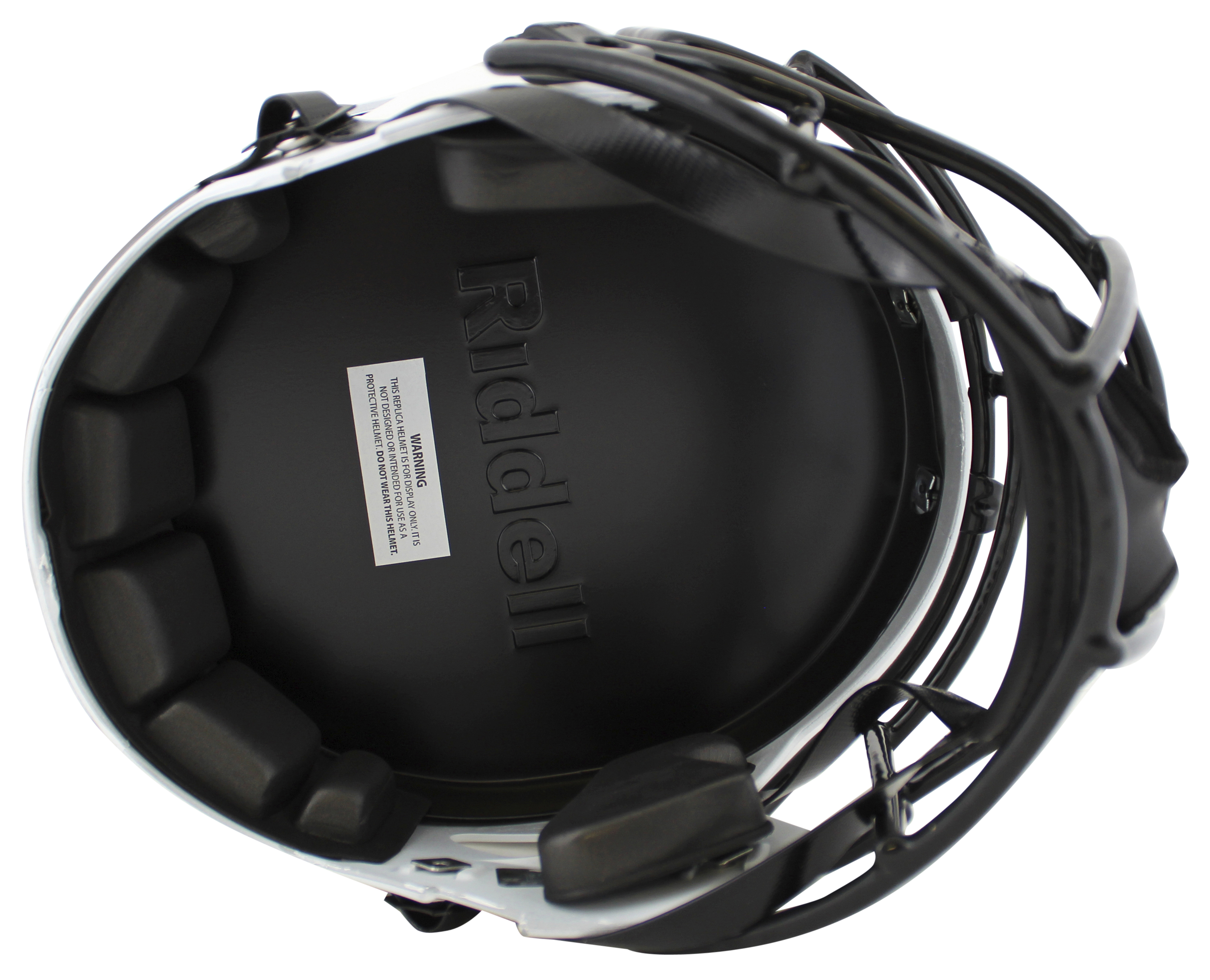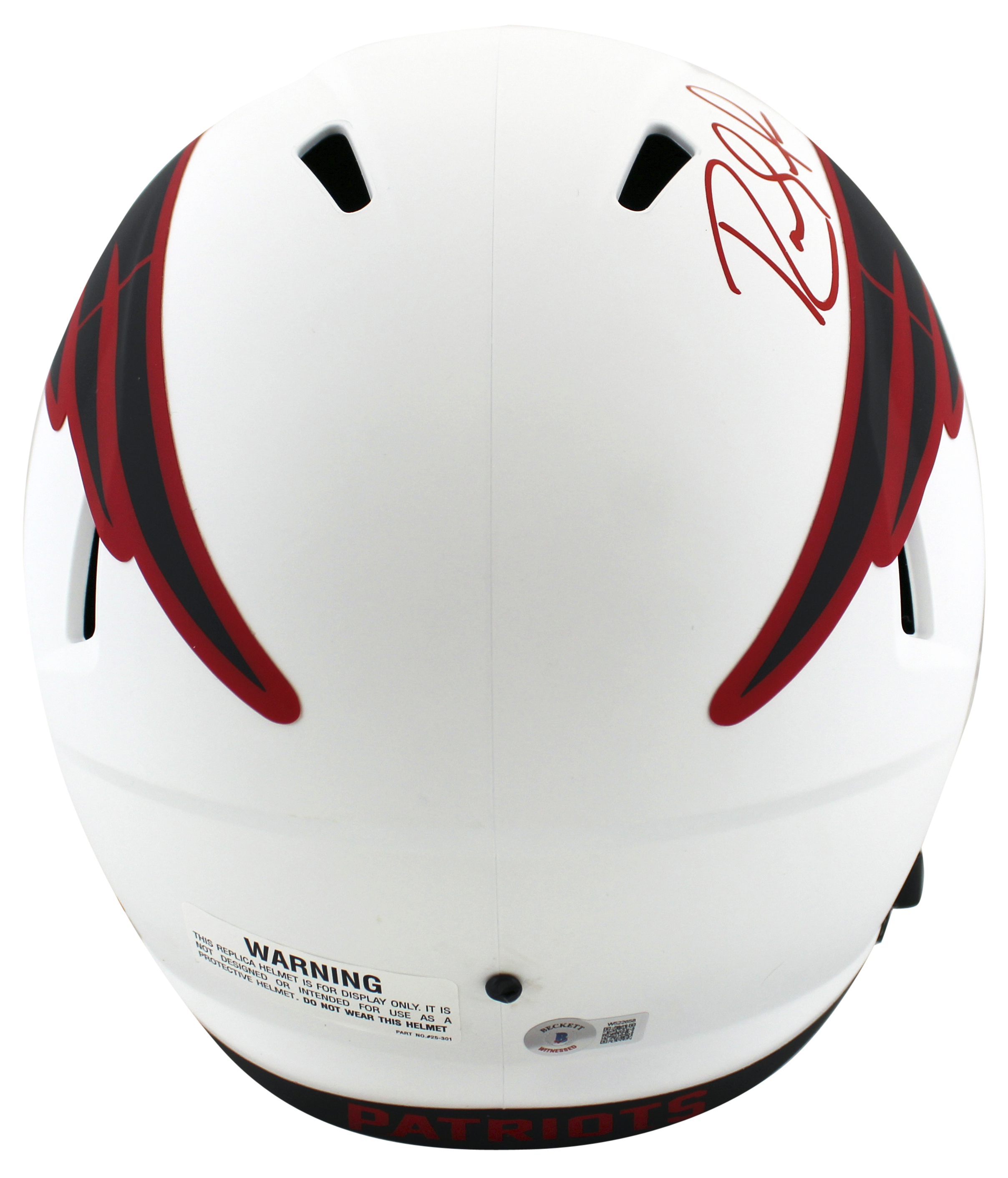 This Autographed Alternate Lunar Riddell Full Size Speed Rep Helmet has been Personally Signed by Randy Moss of the New England Patriots. This item is 100% Authentic to include a hologram by Beckett Authentication Services. This item will come with an affixed Beckett Authentication Services (BAS) authentication sticker, which includes a scannable QR code to verify authenticity. Please note that Beckett no longer provides serial-numbered COA cards, and the attached BAS sticker will serve as the complete authentication for this item. This is a BAS Witnessed Protection Program item which means a Beckett Authentication Service representative was present when this item was being signed. We conducted an autograph signing with Randy Moss where multiples of the same item were signed. While the photographs are representative of this item, the size, placement and strength of the signature may vary. Each item is hand signed, therefore, each autograph is unique. This item can be verified through BAS Witnessed.