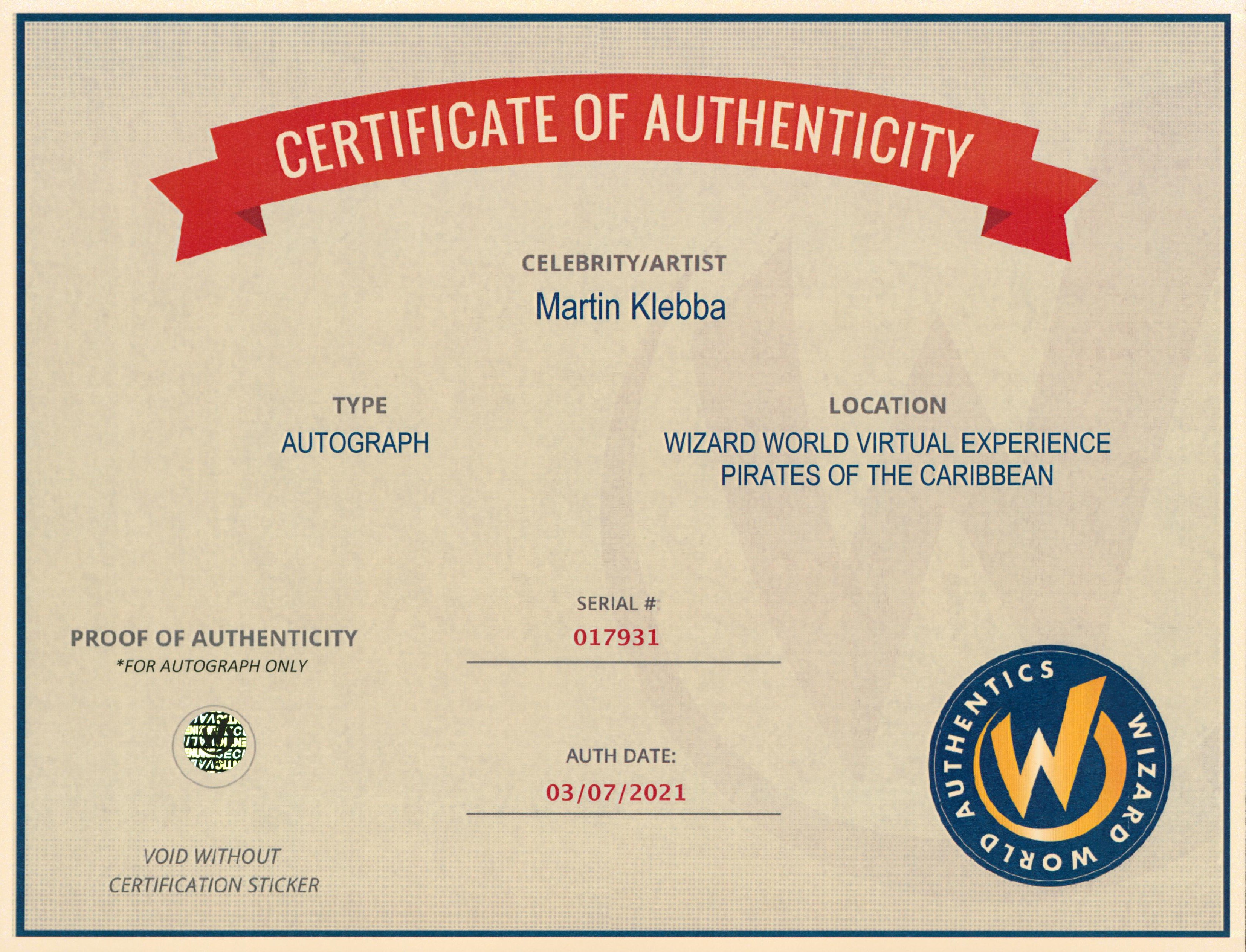 This Autographed 8x10 Photo with the inscription of "Take What You Can, Give Nothin' Back!!! Marty" has been Personally Signed by Martin Klebba of Pirates Of The Caribbean. This item is 100% Authentic to include a Certificate of Authenticity (COA) / hologram by Wizard World Authentics. A Wizard World Authentics representative was present when this item was being signed, the date of the signing is notated on the COA. The authenticity can be verified on Wizard World Authentics website.