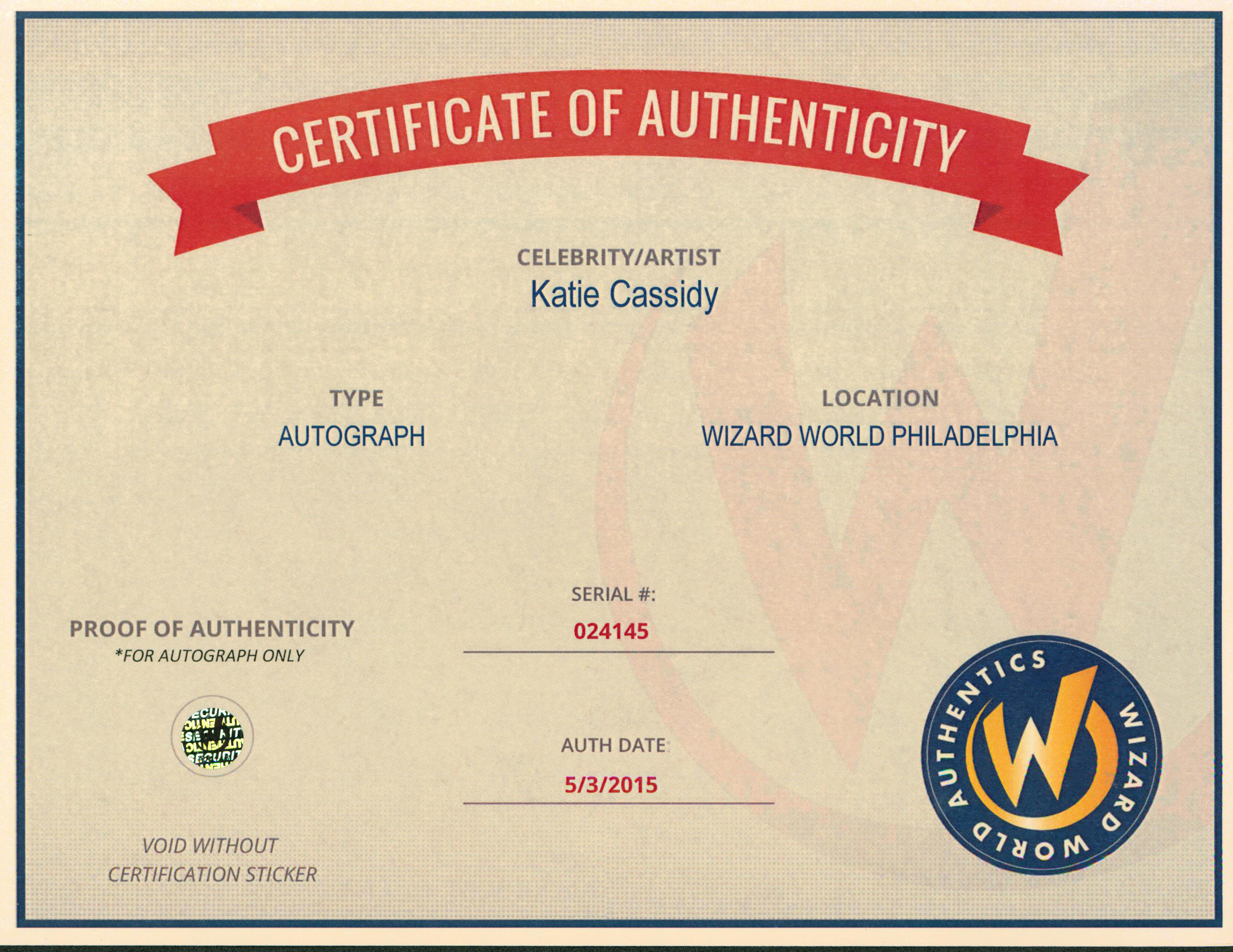 This Autographed 8x10 Photo has been Personally Signed by Katie Cassidy of A Nightmare On Elm Street. This item is 100% Authentic to include a Certificate of Authenticity (COA) / hologram by Wizard World Authentics. A Wizard World Authentics representative was present when this item was being signed, the date of the signing is notated on the COA. The authenticity can be verified on Wizard World Authentics website.