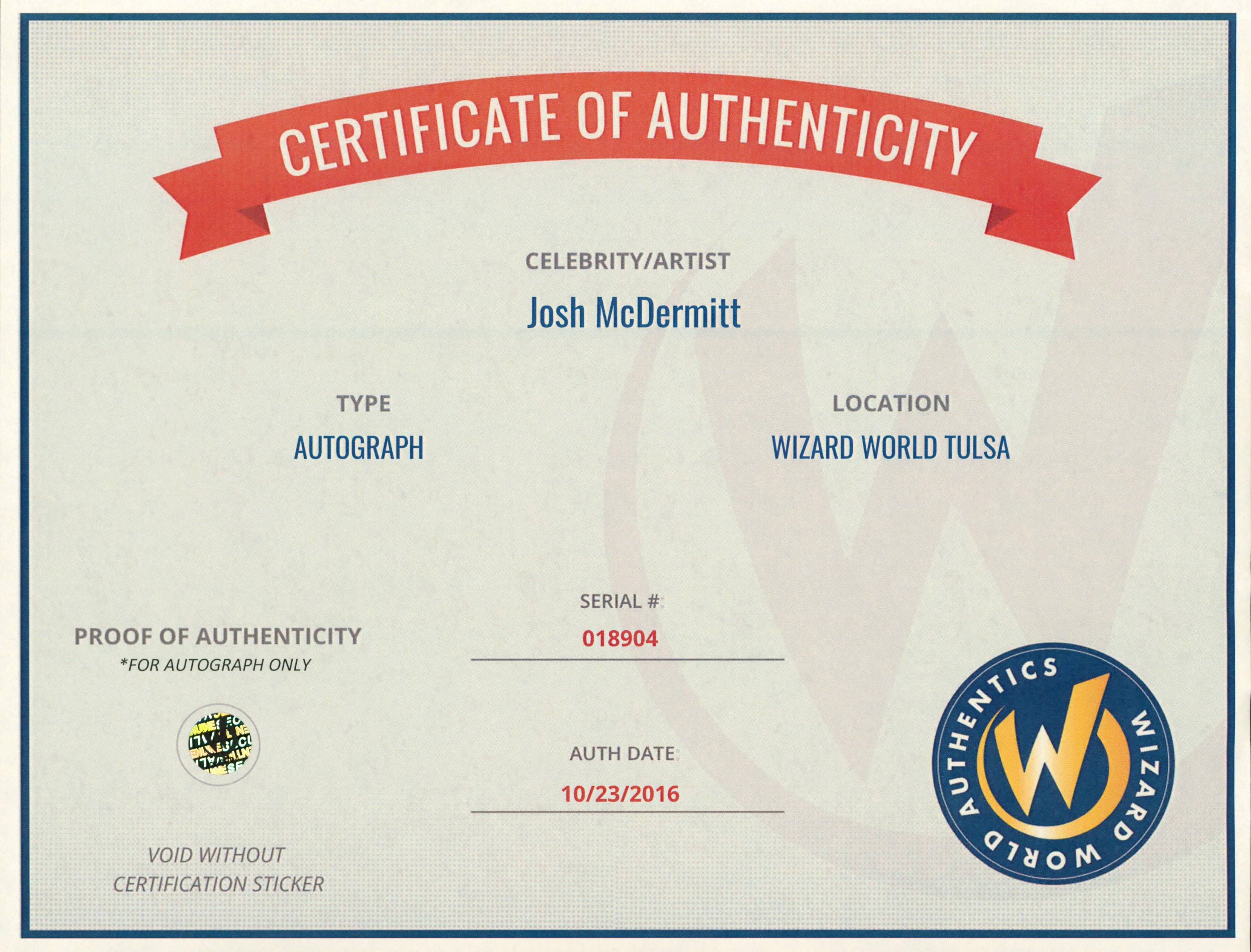This Autographed 8x10 Photo with the inscription of "Eugene" has been Personally Signed by Josh McDermitt of The Walking Dead. This item is 100% Authentic to include a Certificate of Authenticity (COA) / hologram by Wizard World Authentics. A Wizard World Authentics representative was present when this item was being signed, the date of the signing is notated on the COA. The authenticity can be verified on Wizard World Authentics website.