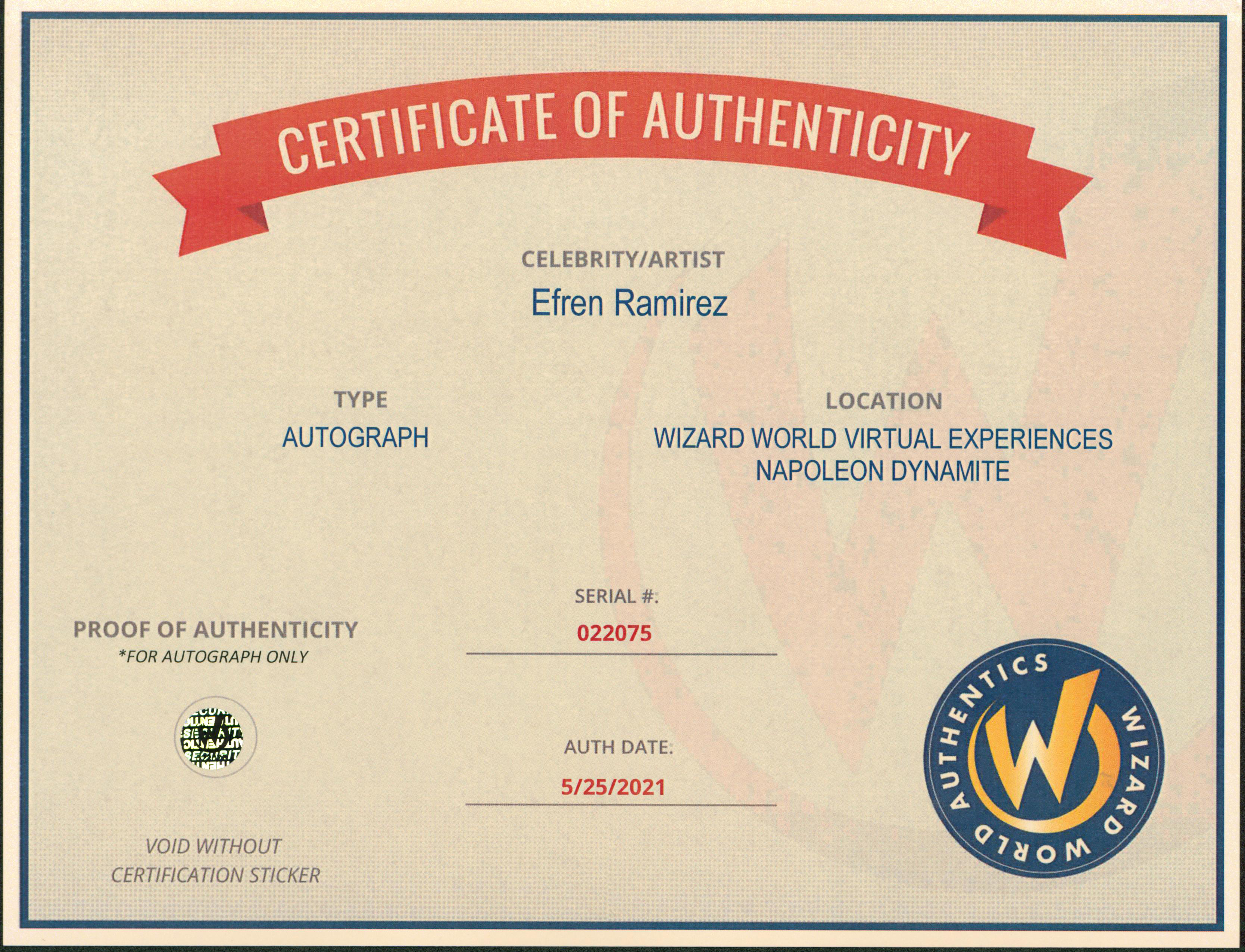 This Autographed 8x10 Photo with the inscription of "Gosh!" has been Personally Signed by Efren Ramirez of Napoleon Dynamite. This item is 100% Authentic to include a Certificate of Authenticity (COA) / hologram by Wizard World Authentics. A Wizard World Authentics representative was present when this item was being signed, the date of the signing is notated on the COA. The authenticity can be verified on Wizard World Authentics website.