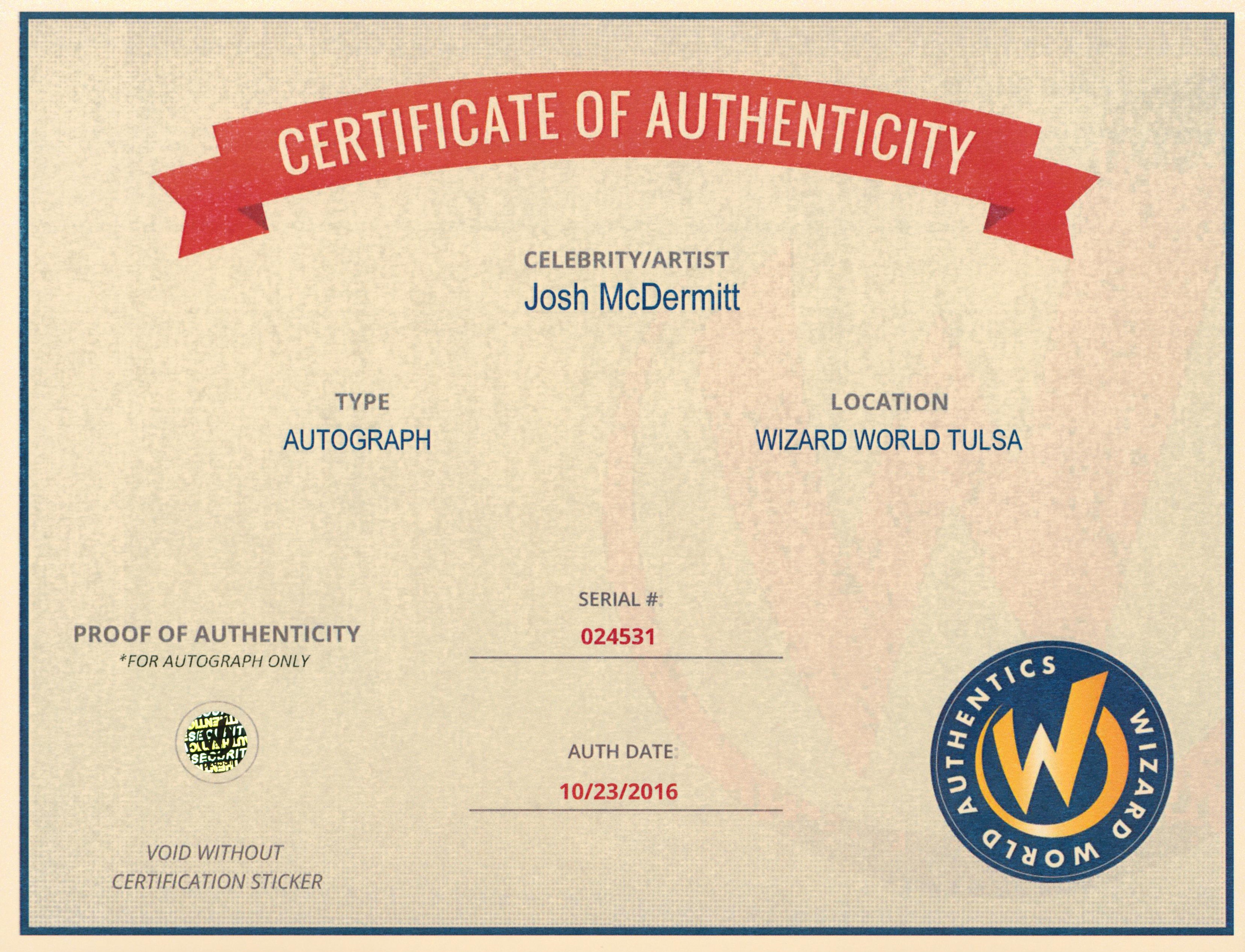 This Autographed 8x10 Photo with the inscription of "Eugene" has been Personally Signed by Josh McDermitt of The Walking Dead. This item is 100% Authentic to include a Certificate of Authenticity (COA) / hologram by Wizard World Authentics. A Wizard World Authentics representative was present when this item was being signed, the date of the signing is notated on the COA. We have multiples of this same item. While the photographs are representative of this item, the size, placement and strength of the signature may vary. Each item is hand signed, therefore, each autograph is unique.