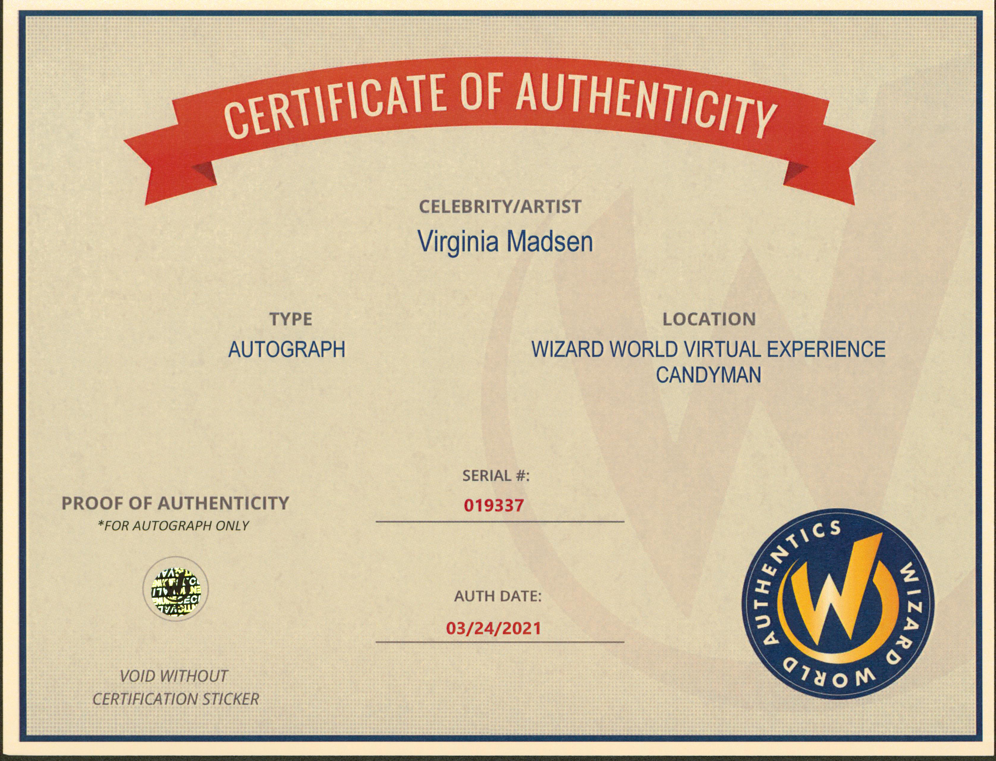This Autographed 8x10 Photo has been Personally Signed by Virginia Madsen of Candyman. This item is 100% Authentic to include a Certificate of Authenticity (COA) / hologram by Wizard World Authentics. A Wizard World Authentics representative was present when this item was being signed, the date of the signing is notated on the COA. The authenticity can be verified on Wizard World Authentics website.