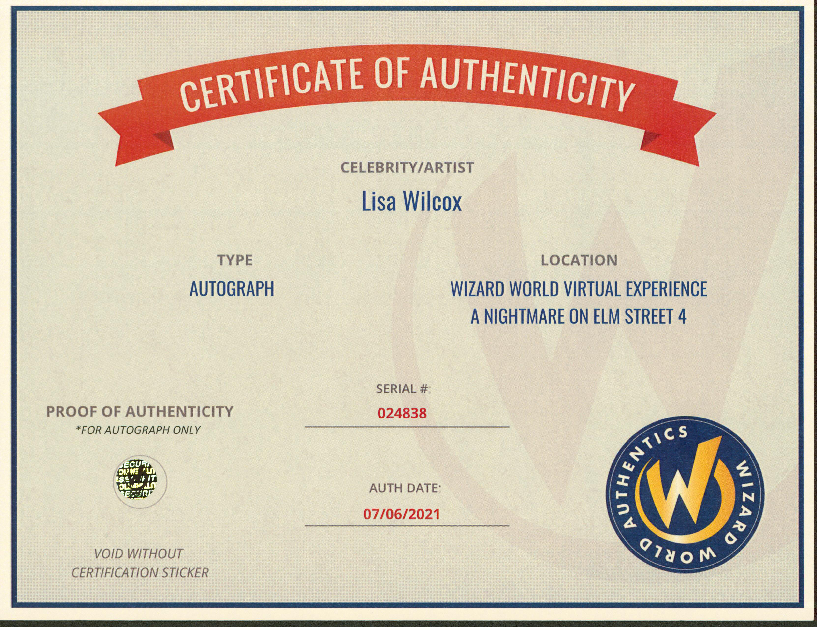 This Autographed 8x10 Photo with the inscription of "Alice" has been Personally Signed by Lisa Wilcox of A Nightmare On Elm Street. This item is 100% Authentic to include a Certificate of Authenticity (COA) / hologram by Wizard World Authentics. A Wizard World Authentics representative was present when this item was being signed, the date of the signing is notated on the COA. We have multiples of this same item. While the photographs are representative of this item, the size, placement and strength of the signature may vary. Each item is hand signed, therefore, each autograph is unique.