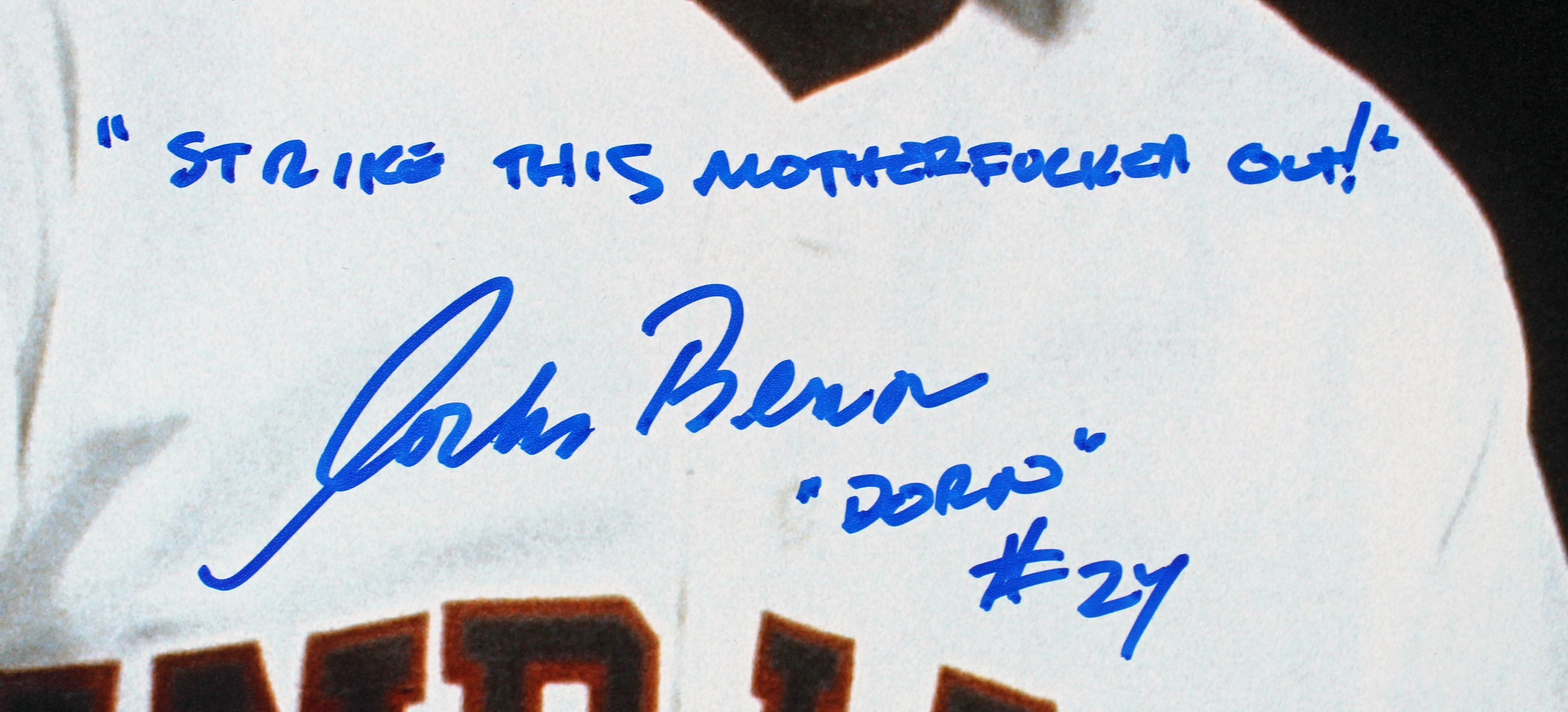 This Autographed 16x20 Photo with the inscription of "Strike This Motherfucker Out Dorn #24 (Bernsen), #99 Sheen" has been Personally Signed by Charlie Sheen & Corbin Bernsen of Major League. This item is 100% Authentic to include a Certificate of Authenticity (COA) / hologram by Beckett Authentication Services. This is a BAS Witnessed Protection Program item which means a Beckett Authentication Service representative was present when this item was being signed. We conducted an autograph signing with Charlie Sheen & Corbin Bernsen where multiples of the same item were signed. While the photographs are representative of this item, the size, placement and strength of the signature may vary. Each item is hand signed, therefore, each autograph is unique.