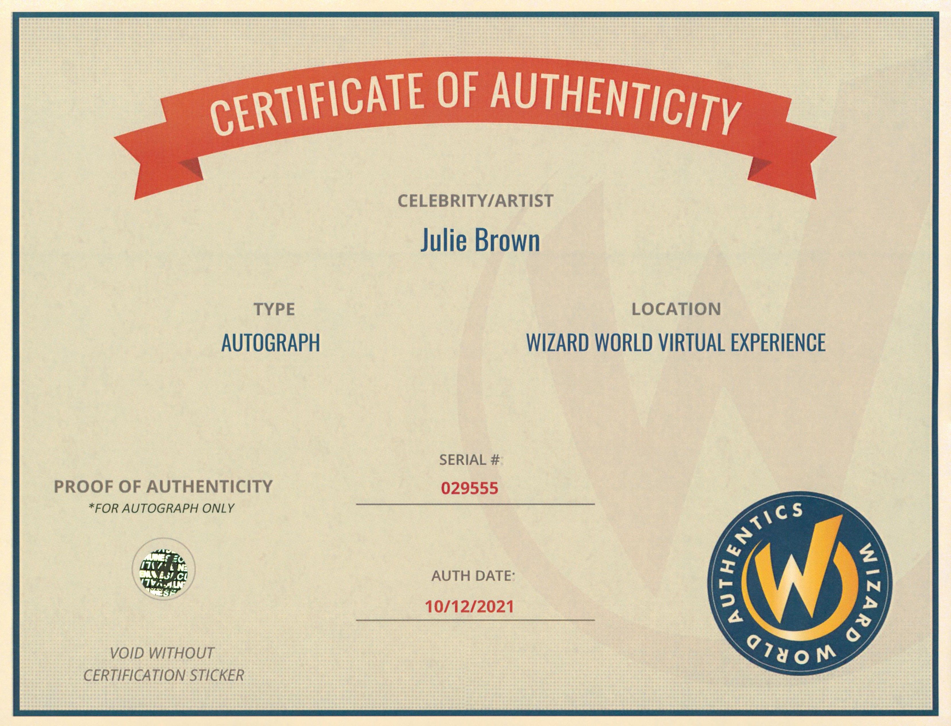 This Autographed 8x10 Photo has been Personally Signed by Julie Brown of Clueless. This item is 100% Authentic to include a Certificate of Authenticity (COA) / hologram by Wizard World Authentics. A Wizard World Authentics representative was present when this item was being signed, the date of the signing is notated on the COA. We have multiples of this same item. While the photographs are representative of this item, the size, placement and strength of the signature may vary. Each item is hand signed, therefore, each autograph is unique.