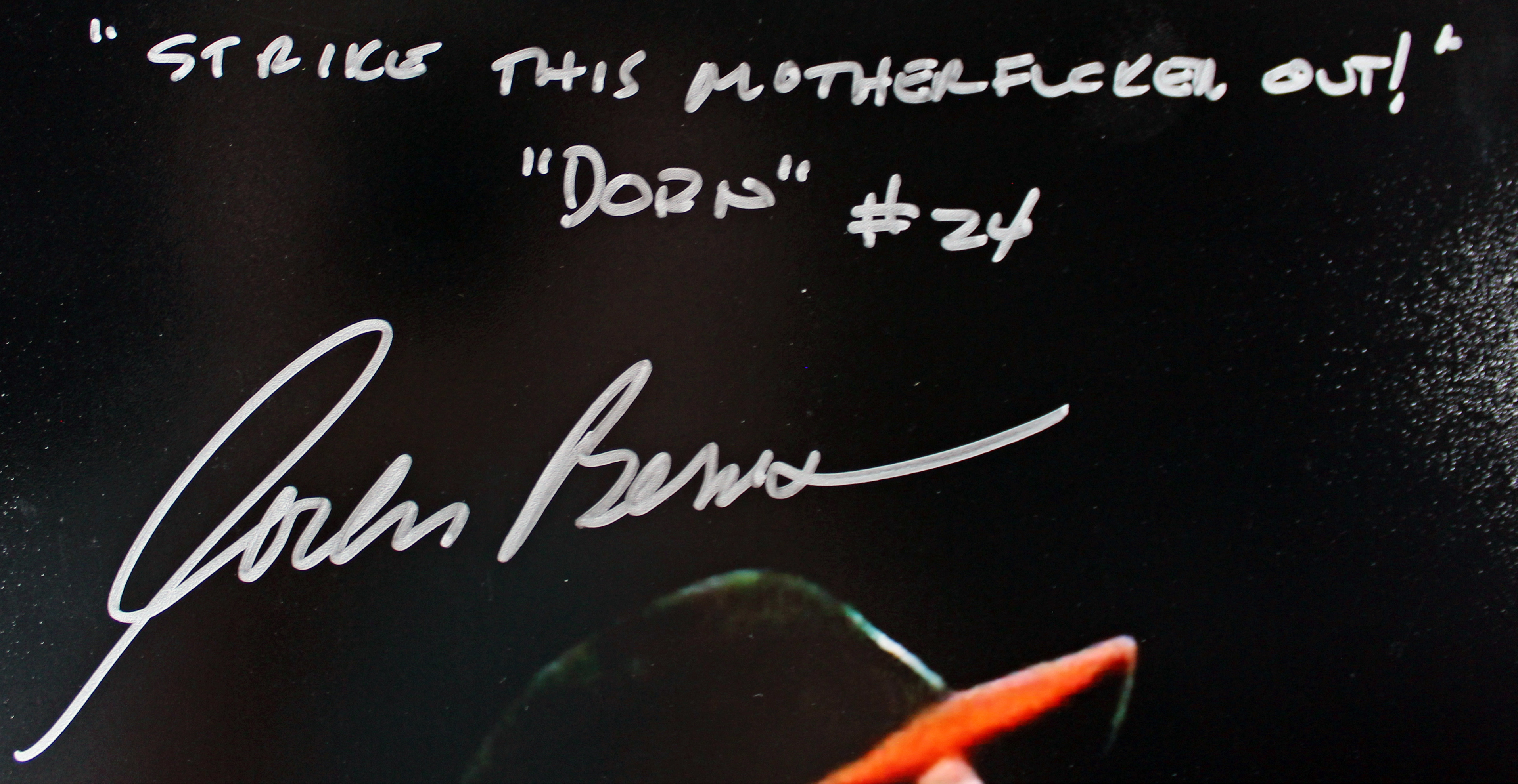 This Autographed 16x20 Photo with the inscription of "Strike This Motherfucker Out Dorn #24 (Bernsen), #99 Sheen" has been Personally Signed by Charlie Sheen & Corbin Bernsen of Major League. This item is 100% Authentic to include a hologram by Beckett Authentication Services. This item will come with an affixed Beckett Authentication Services (BAS) authentication sticker, which includes a scannable QR code to verify authenticity. Please note that Beckett no longer provides serial-numbered COA cards, and the attached BAS sticker will serve as the complete authentication for this item. This is a BAS Witnessed Protection Program item which means a Beckett Authentication Service representative was present when this item was being signed. We conducted an autograph signing with Charlie Sheen & Corbin Bernsen where multiples of the same item were signed. While the photographs are representative of this item, the size, placement and strength of the signature may vary. Each item is hand signed, therefore, each autograph is unique.
