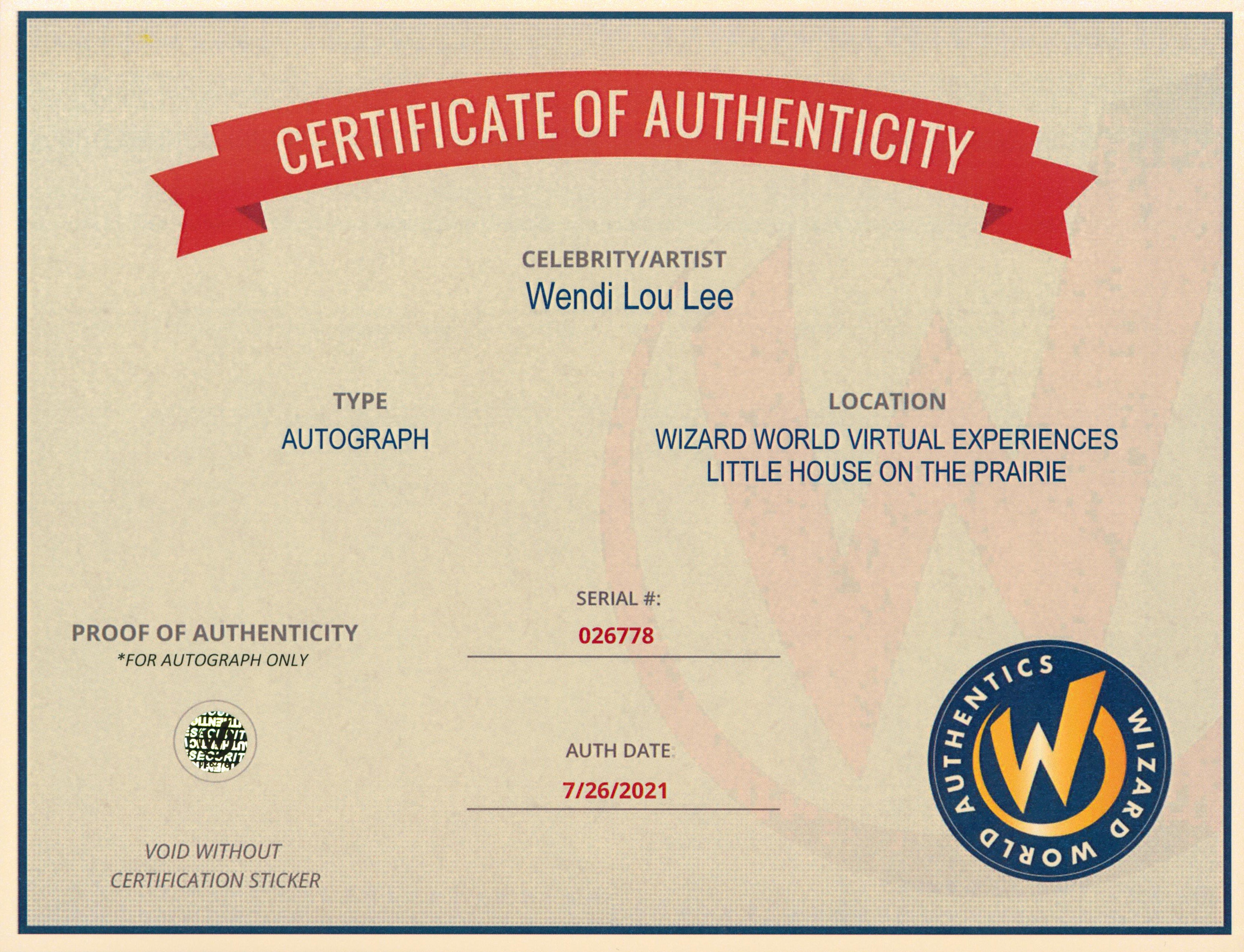 This Autographed 8x10 Photo with the inscription of "Baby Grace" has been Personally Signed by Wendy Lou Lee of Little House on the Prairie. This item is 100% Authentic to include a Certificate of Authenticity (COA) / hologram by Wizard World Authentics. A Wizard World Authentics representative was present when this item was being signed, the date of the signing is notated on the COA. We have multiples of this same item. While the photographs are representative of this item, the size, placement and strength of the signature may vary. Each item is hand signed, therefore, each autograph is unique.