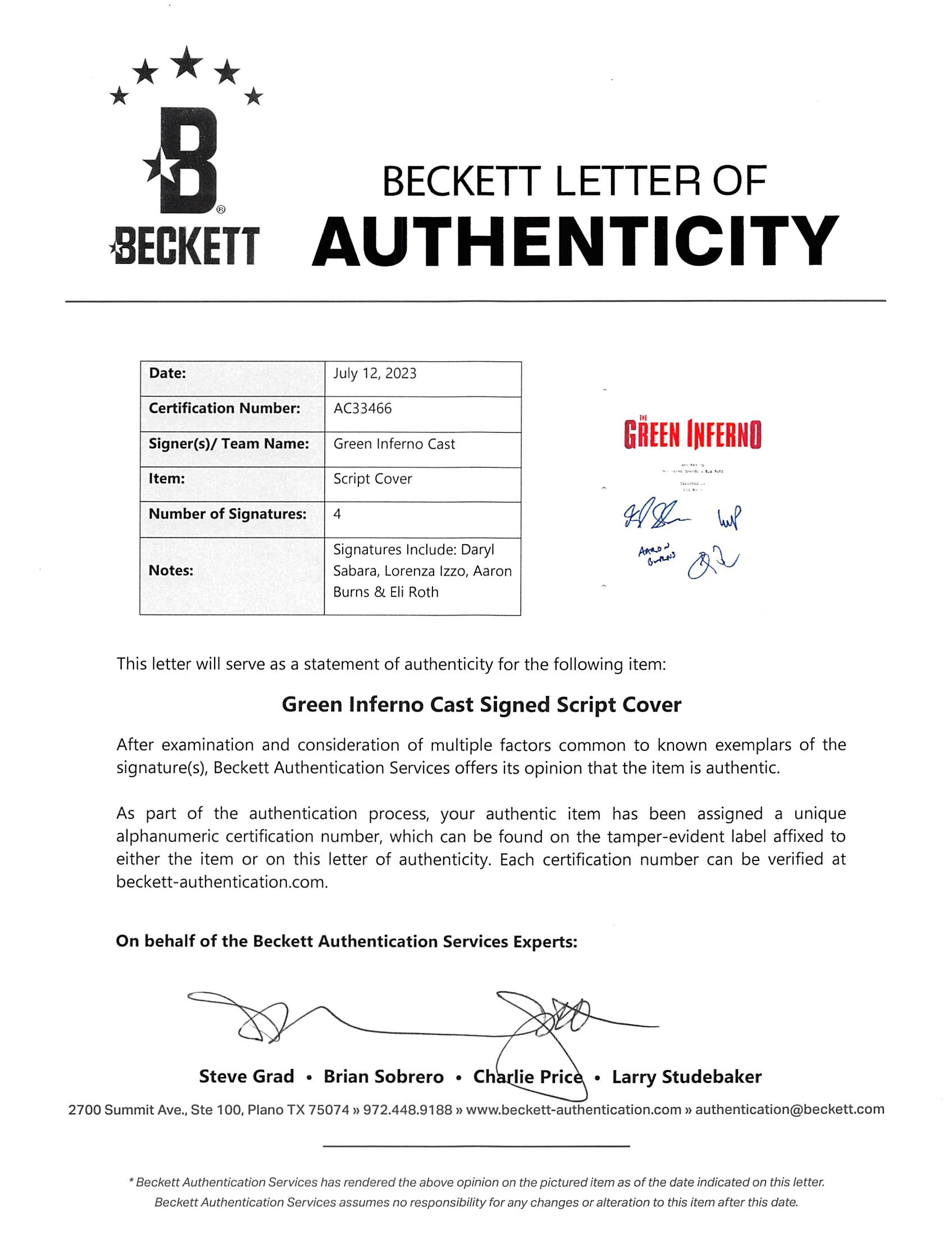 This Autographed Script Cover has been Personally Signed by Daryl Sabara, Lorenza Izzo, Aaron Burns, & Eli Roth of The Green Inferno. This item is 100% Authentic to include a hologram by Beckett Authentication Services. This item will come with an affixed Beckett Authentication Services (BAS) authentication sticker, which includes a scannable QR code to verify authenticity. Please note that Beckett no longer provides serial-numbered COA cards, and the attached BAS sticker will serve as the complete authentication for this item. The authenticity can be verified on Beckett Authentication Services website.