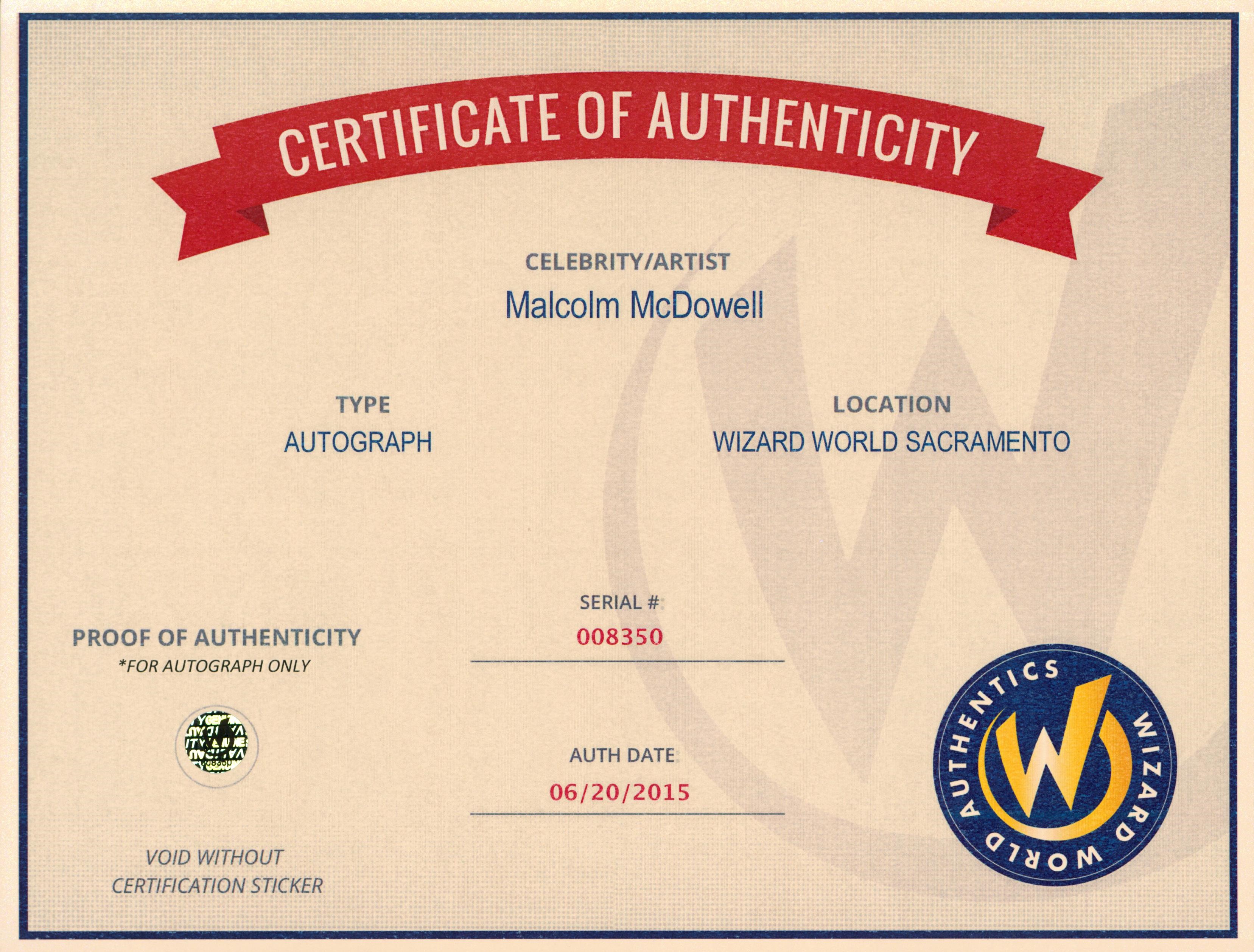 This Autographed 8x10 Photo has been Personally Signed by Malcolm McDowell of A Clockwork Orange. This item is 100% Authentic to include a Certificate of Authenticity (COA) / hologram by Wizard World Authentics. A Wizard World Authentics representative was present when this item was being signed, the date of the signing is notated on the COA. We have multiples of this same item. While the photographs are representative of this item, the size, placement and strength of the signature may vary. Each item is hand signed, therefore, each autograph is unique.