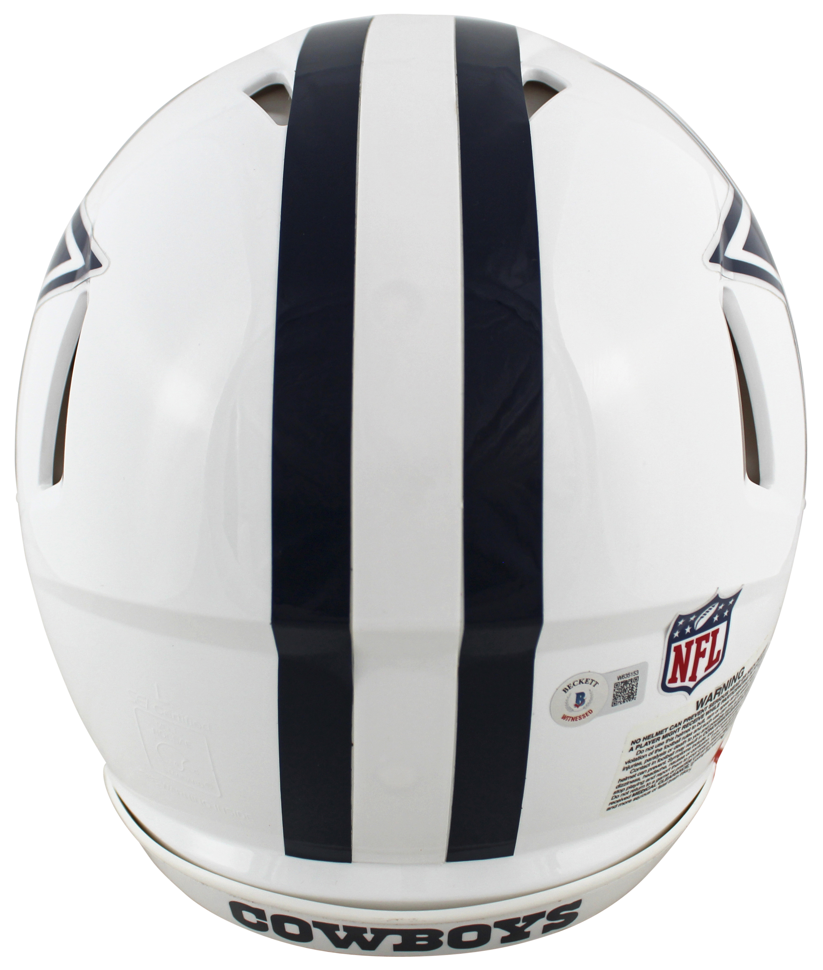This Autographed 2022 Alternate White Authentic Full Size Speed Proline Helmet has been Personally Signed by Dak Prescott of the Dallas Cowboys. This item is 100% Authentic to include a hologram by Beckett Authentication Services. This item will come with an affixed Beckett Authentication Services (BAS) authentication sticker, which includes a scannable QR code to verify authenticity. Please note that Beckett no longer provides serial-numbered COA cards, and the attached BAS sticker will serve as the complete authentication for this item. This is a BAS Witnessed Protection Program item which means a Beckett Authentication Service representative was present when this item was being signed. We conducted an autograph signing with Dak Prescott where multiples of the same item were signed. While the photographs are representative of this item, the size, placement and strength of the signature may vary. Each item is hand signed, therefore, each autograph is unique. This item can be verified through BAS Witnessed.