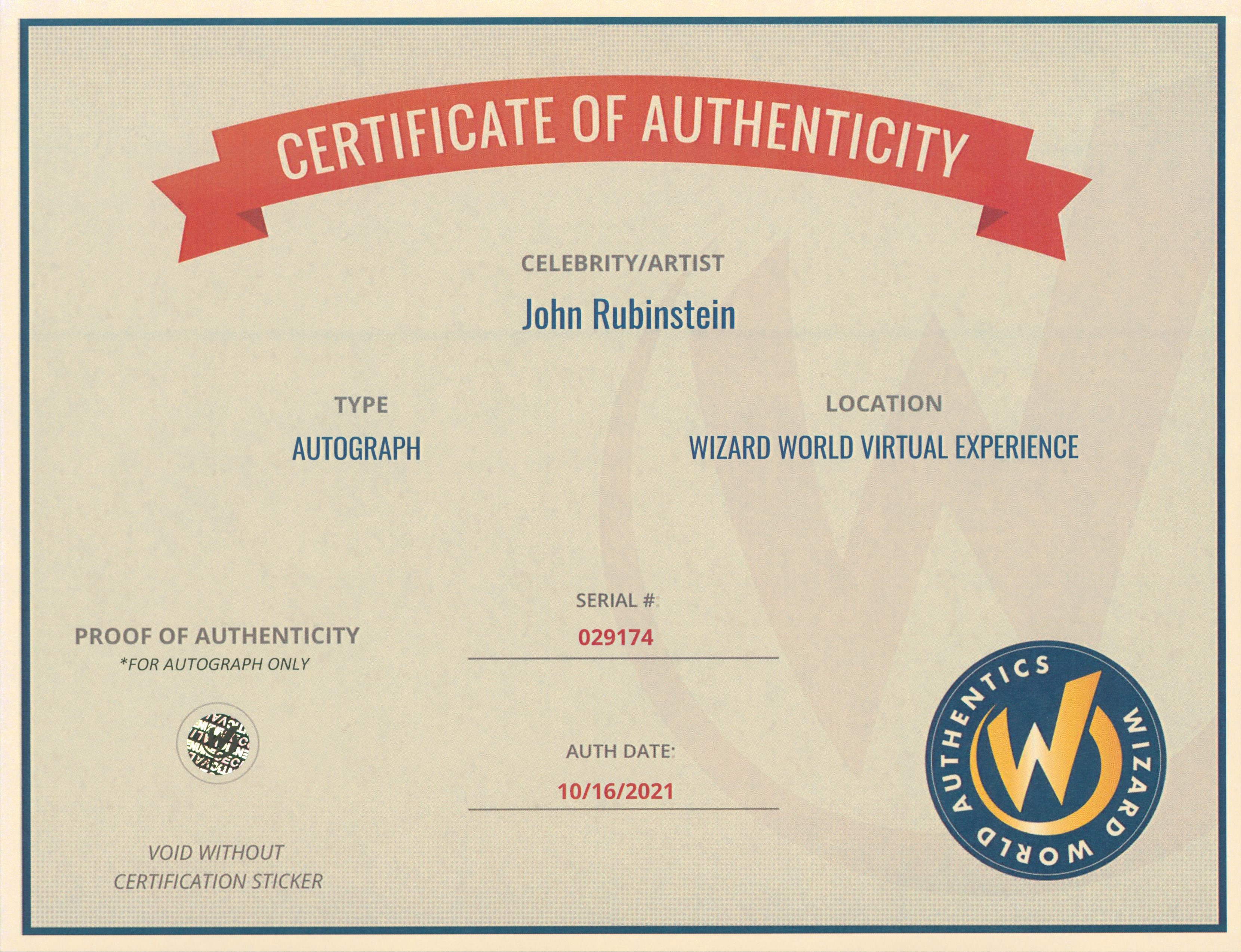 This Autographed 8x10 Photo has been Personally Signed by John Rubinstein of Star Trek Enterprise. This item is 100% Authentic to include a Certificate of Authenticity (COA) / hologram by Wizard World Authentics. A Wizard World Authentics representative was present when this item was being signed, the date of the signing is notated on the COA. We have multiples of this same item. While the photographs are representative of this item, the size, placement and strength of the signature may vary. Each item is hand signed, therefore, each autograph is unique.
