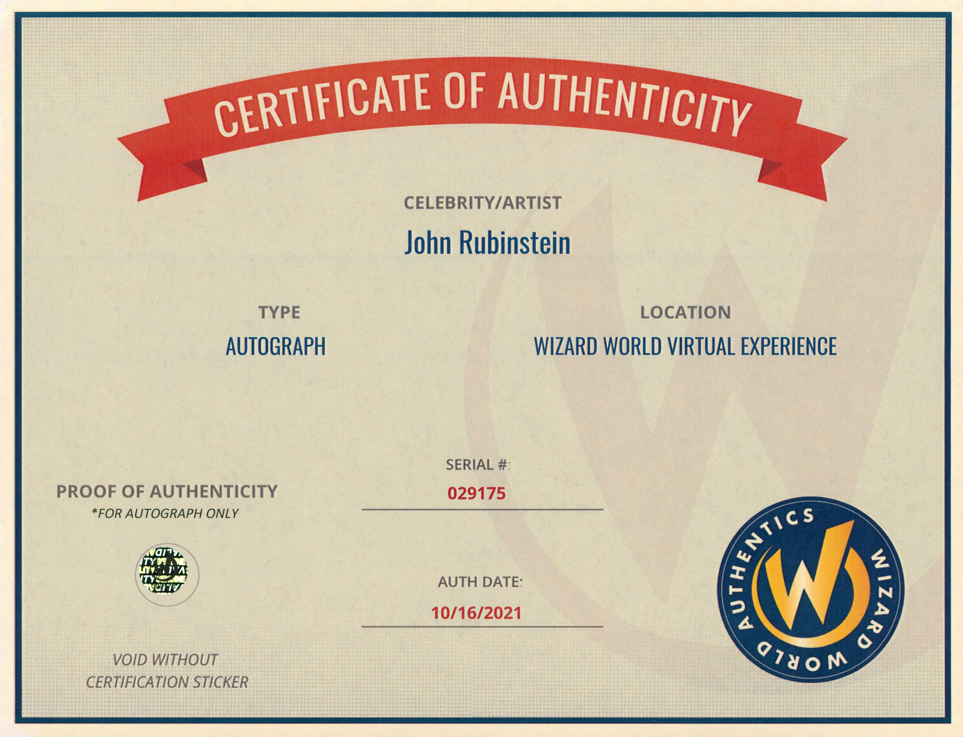 This Autographed 8x10 Photo has been Personally Signed by John Rubinstein of Star Trek Enterprise. This item is 100% Authentic to include a Certificate of Authenticity (COA) / hologram by Wizard World Authentics. A Wizard World Authentics representative was present when this item was being signed, the date of the signing is notated on the COA. We have multiples of this same item. While the photographs are representative of this item, the size, placement and strength of the signature may vary. Each item is hand signed, therefore, each autograph is unique.