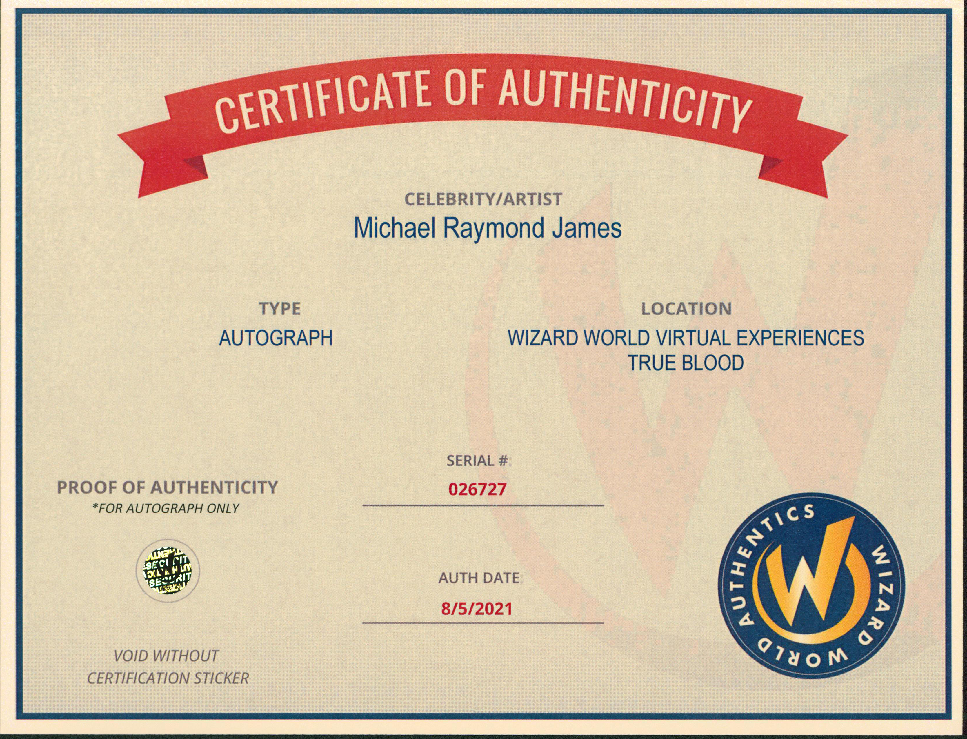 This Autographed 8x10 Photo has been Personally Signed by Michael Raymond James of Jack Reacher. This item is 100% Authentic to include a Certificate of Authenticity (COA) / hologram by Wizard World Authentics. A Wizard World Authentics representative was present when this item was being signed, the date of the signing is notated on the COA. We have multiples of this same item. While the photographs are representative of this item, the size, placement and strength of the signature may vary. Each item is hand signed, therefore, each autograph is unique.