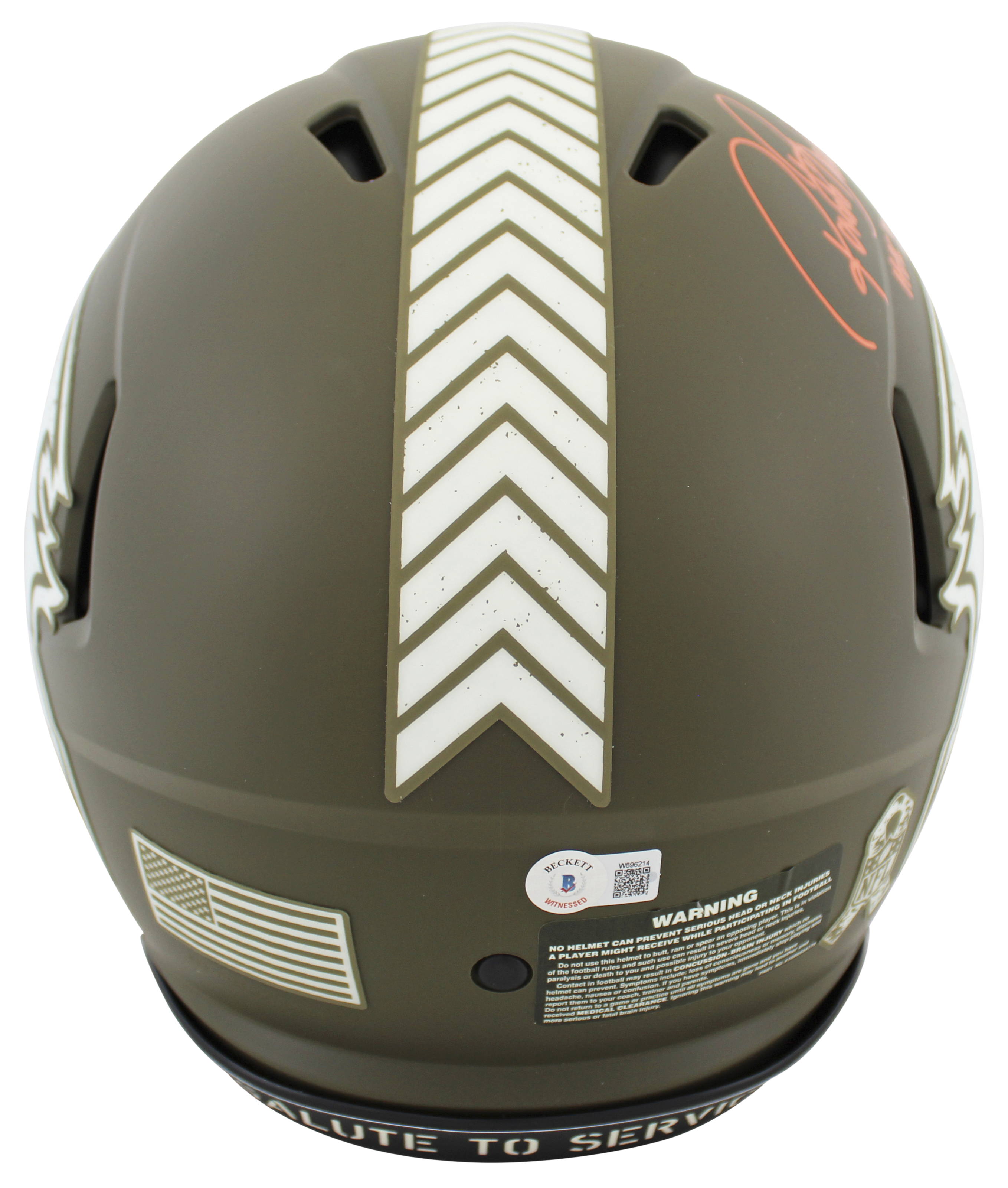 This Autographed Alternate Salute To Service Riddell Authentic Full Size Speed Proline Helmet with the inscription of "HOF 23" has been Personally Signed by Ronde Barber of the Tampa Bay Buccaneers. This item is 100% Authentic to include a hologram by Beckett Authentication Services. This item will come with an affixed Beckett Authentication Services (BAS) authentication sticker, which includes a scannable QR code to verify authenticity. Please note that Beckett no longer provides serial-numbered COA cards, and the attached BAS sticker will serve as the complete authentication for this item. This is a BAS Witnessed Protection Program item which means a Beckett Authentication Service representative was present when this item was being signed. We conducted an autograph signing with Ronde Barber where multiples of the same item were signed. While the photographs are representative of this item, the size, placement and strength of the signature may vary. Each item is hand signed, therefore, each autograph is unique. This item can be verified through BAS Witnessed.